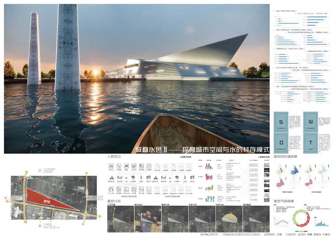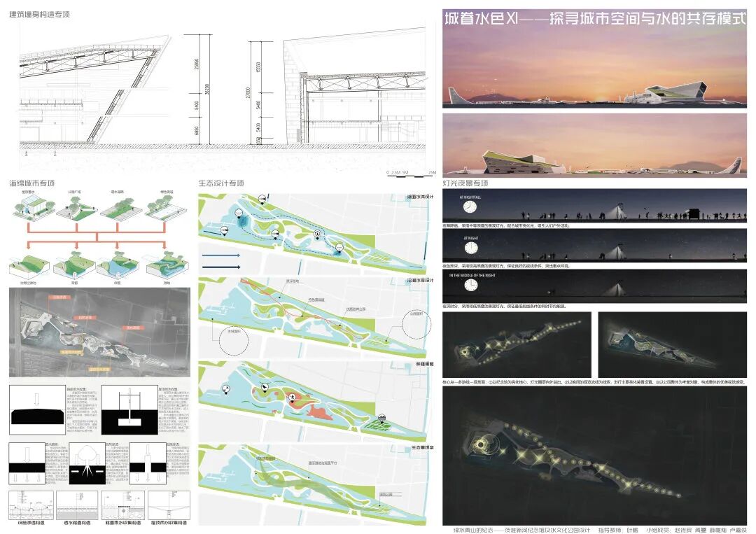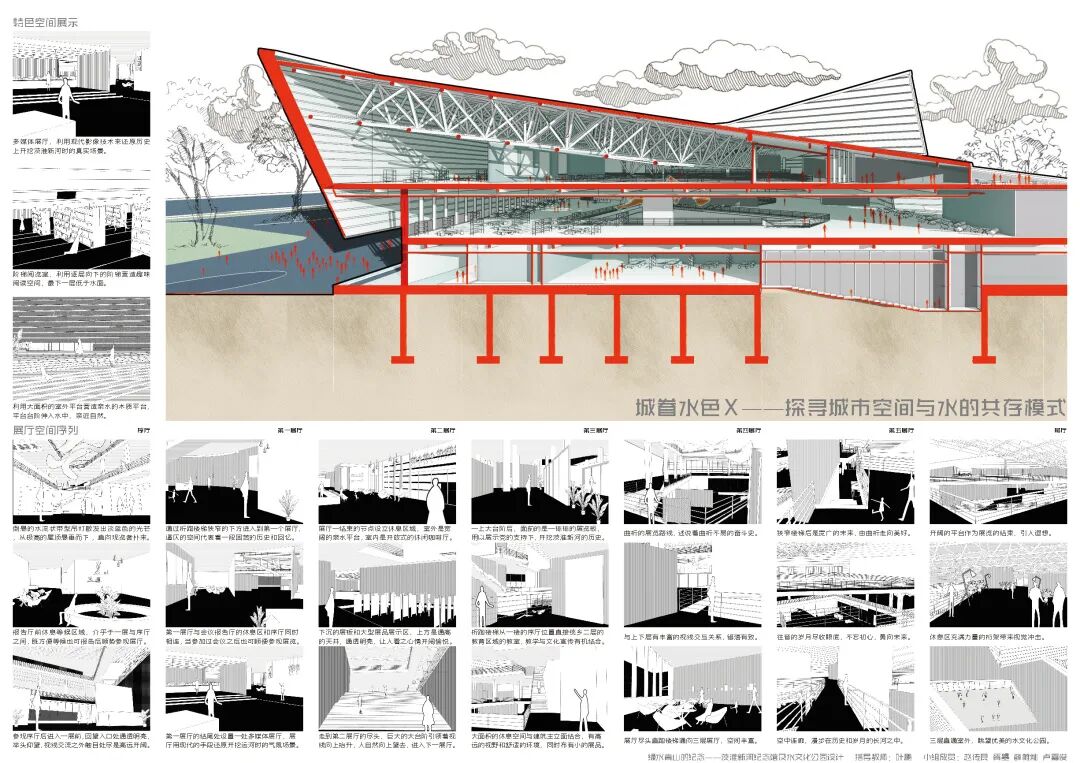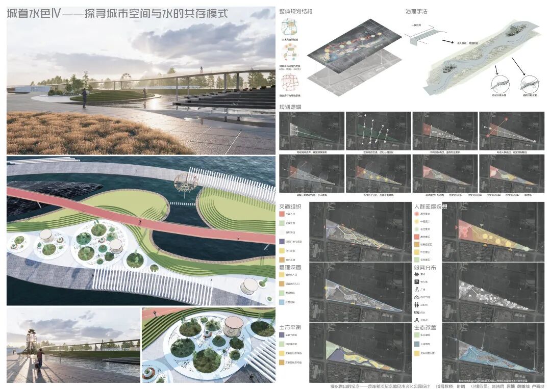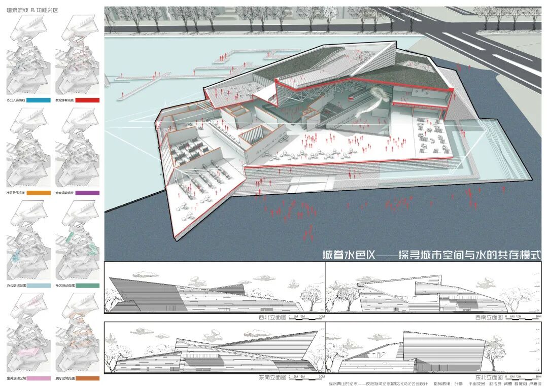 本次的纪念馆与水文化公园设计,通过水元素在城市环境中存在形式的设计尝试,探讨了水对城市的物质价值与精神意义;通过茨淮新河纪念馆的设计尝试,探究了纪念性建筑的设计特点与事件纪念的特殊性;通过水系规划与景观设计贯彻并创新发展了绿色建筑与海绵城市等设计理念。本设计基于用户体验相关的设计逻辑,从市民的需求出发,包含规划设计、具体方案和专项深化三个核心设计环节,涉及建筑设计、城市设计、景观设计和交互设计等多设计学科的专有或交叉领域知识,全面且深入地尝试使用设计解决城市特色风貌建设、建筑设计理论创新、城市旅游产业发展、城市水资源节用与净化等社会问题,对于设计学科交叉和现代城市建设等相关方面的研究具有较好的参考价值与示范意义。