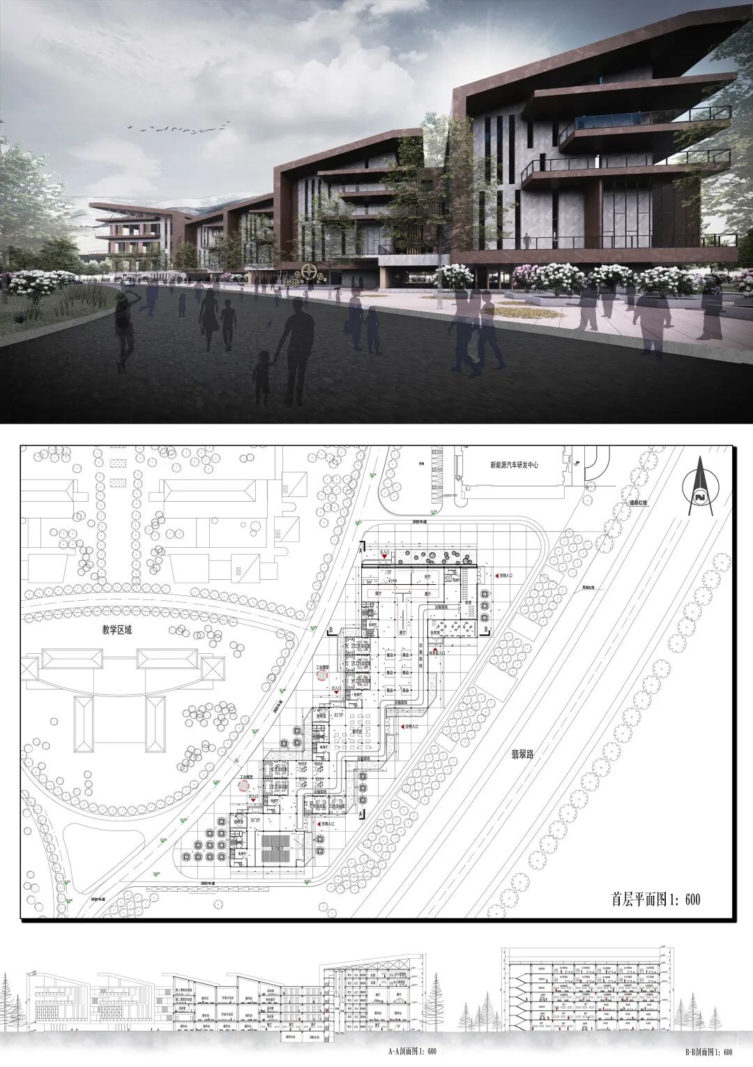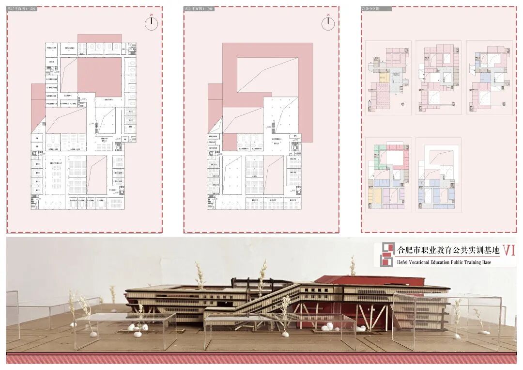 合肥市职业教育公共实训基地致力于面向当地主导产业、面向院校、面向社会打造产学术研发和创业教育的服务平台。该基地位于封闭的职业学校内部,同时又要面向公众开放。空间既要符合人体尺度,又要适配大机器生产的尺度。本方案用两个庭院限定出面向校内与校外的主要入口,形成良好的引导。在空间布局上,采用“庭院式+独立式”布局,外围环绕一般尺度的理论教学空间,内部错列布置大尺度实训生产车间。两套形体采用两套尺度,实现理论与生产紧密结合、机器与人体尺度相互独立、校园文化与工业文化相融合。