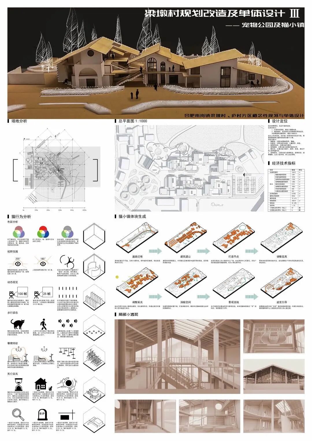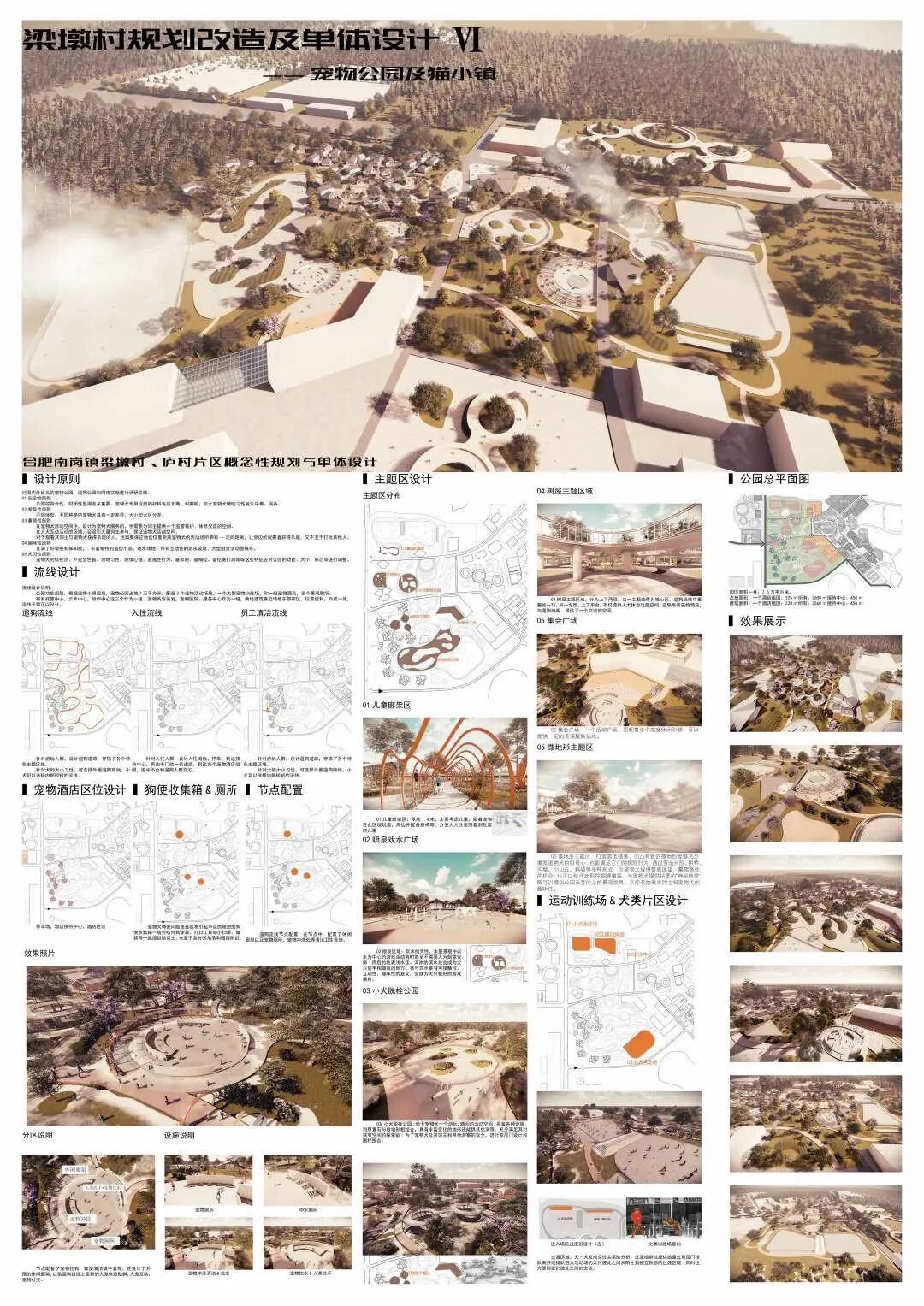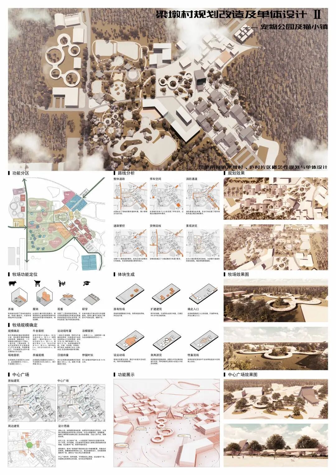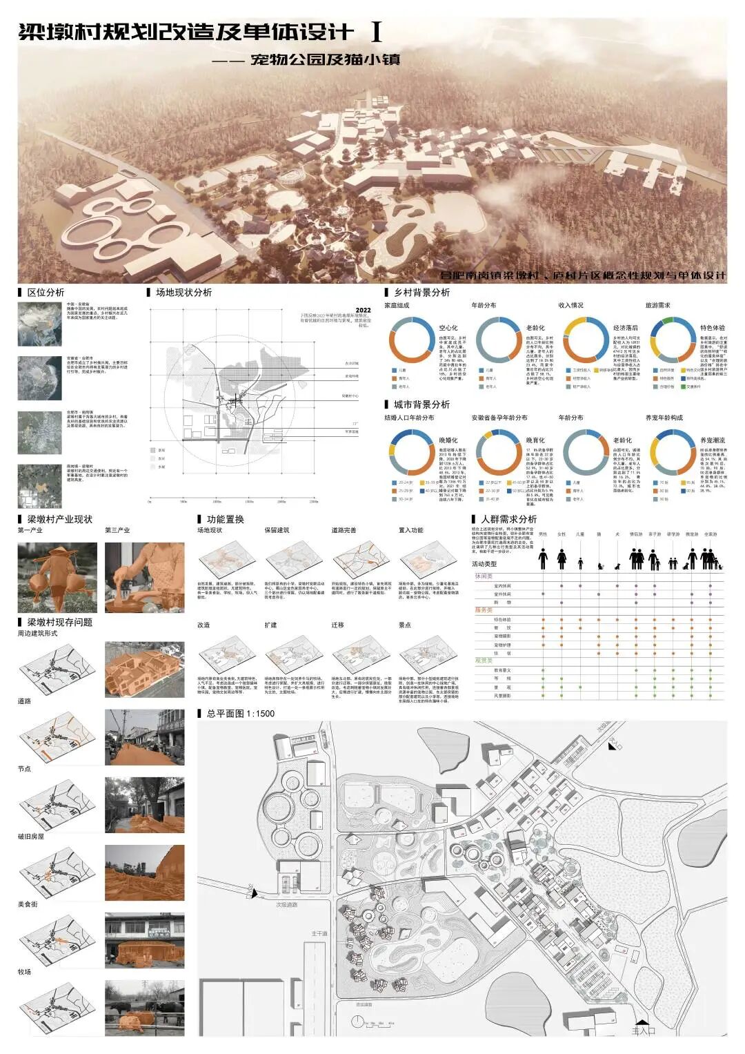 随着我国的快速发展,城市居民的老龄化、少子化、晚婚化以及不婚化现象逐渐显著,带动了宠物经济的快速发展,这可能会成为一个带动乡村振兴的机会。梁墩村是一个背靠大城市的欠发展乡村,本团队拟利用宠物经济来带动小镇人气,谋求发展。在场地中通过保留住区,拆除危楼,扩建牧场,改造商业区,置入宠物公园,五个步骤将宠物主题置入到整个小镇。重点打造猫主题街区——在此希望游客以猫的视角体验商业街区,增加研学游、情侣游的体验感。狗主题公园——打造专业、安全的犬类公园,增加游客携宠游、亲子游、周末游的乐趣。