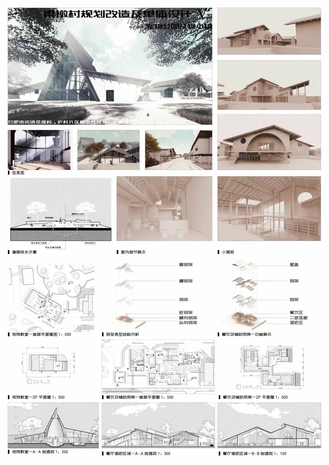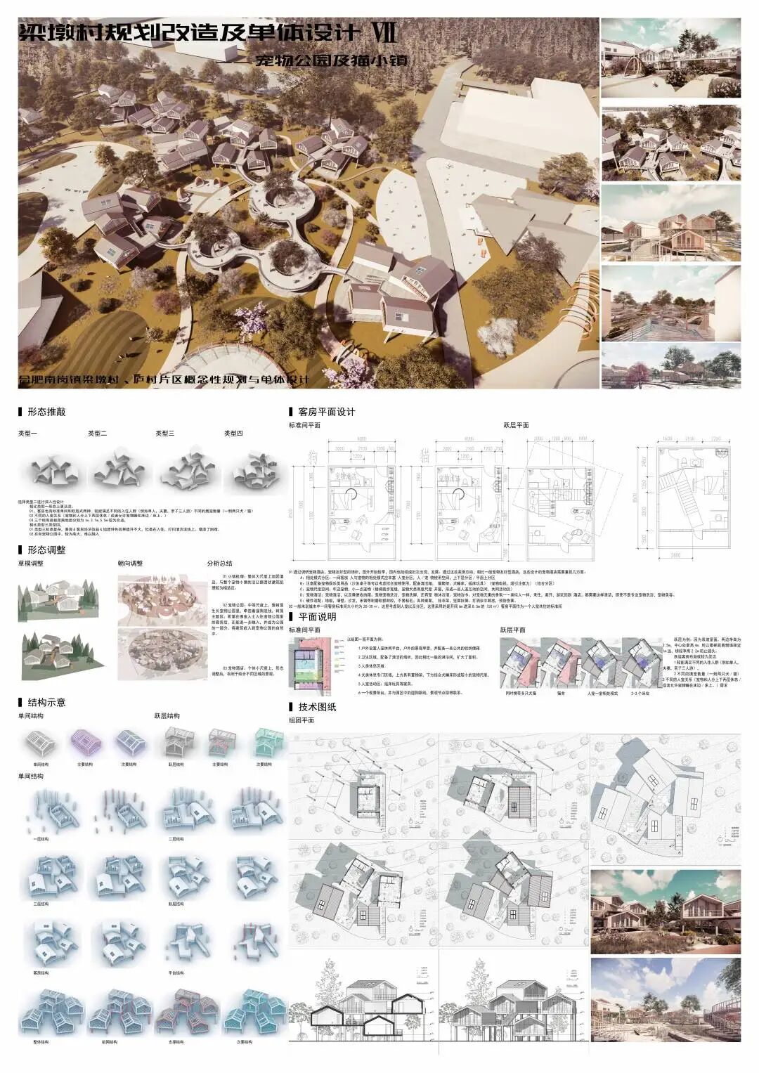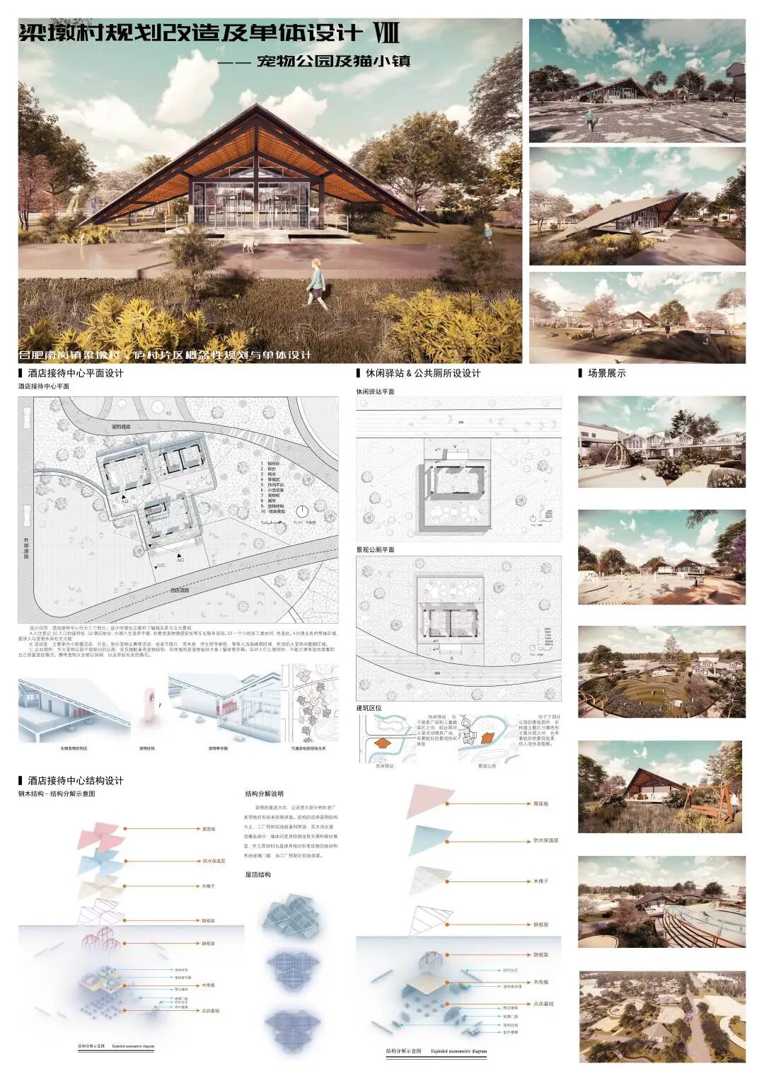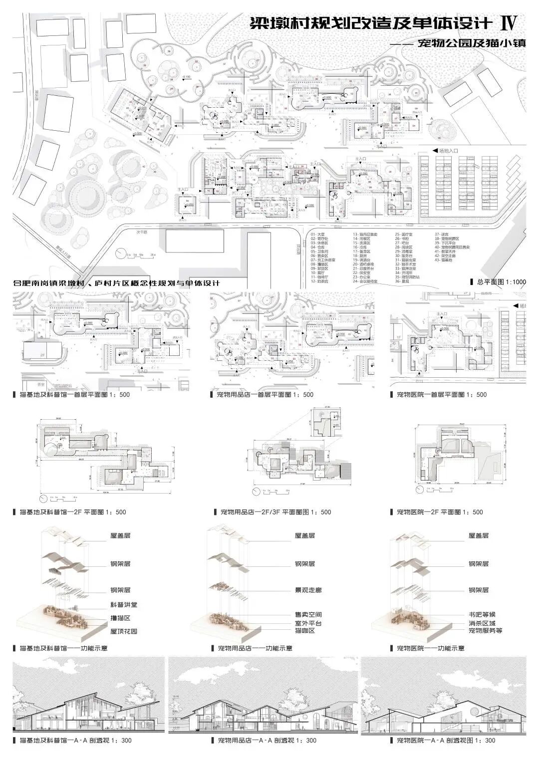 随着我国的快速发展,城市居民的老龄化、少子化、晚婚化以及不婚化现象逐渐显著,带动了宠物经济的快速发展,这可能会成为一个带动乡村振兴的机会。梁墩村是一个背靠大城市的欠发展乡村,本团队拟利用宠物经济来带动小镇人气,谋求发展。在场地中通过保留住区,拆除危楼,扩建牧场,改造商业区,置入宠物公园,五个步骤将宠物主题置入到整个小镇。重点打造猫主题街区——在此希望游客以猫的视角体验商业街区,增加研学游、情侣游的体验感。狗主题公园——打造专业、安全的犬类公园,增加游客携宠游、亲子游、周末游的乐趣。