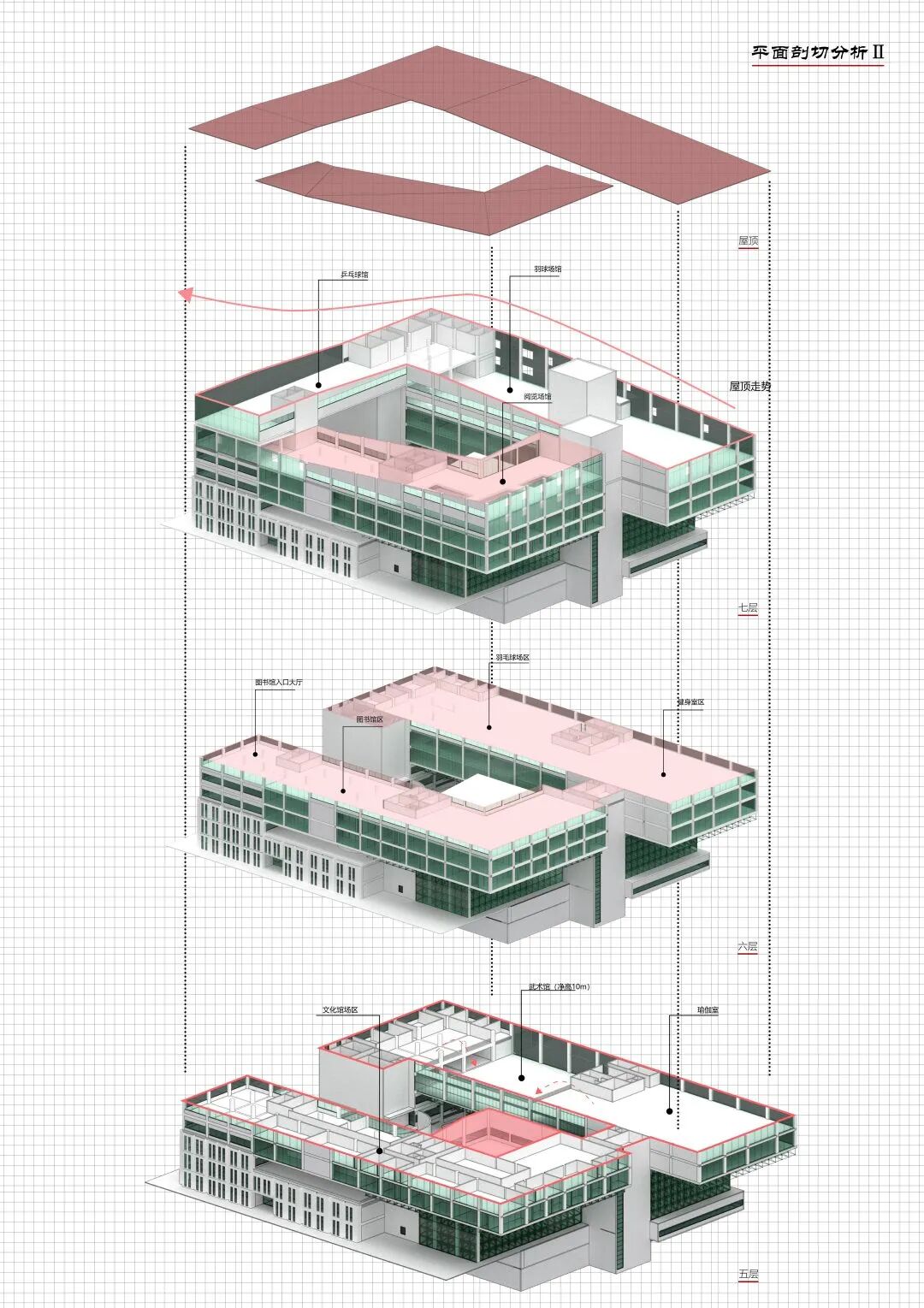 我们的设计中这一条向上攀爬的绿意,在建筑上留下了它经过的痕迹,形成现在一股向上的动势。