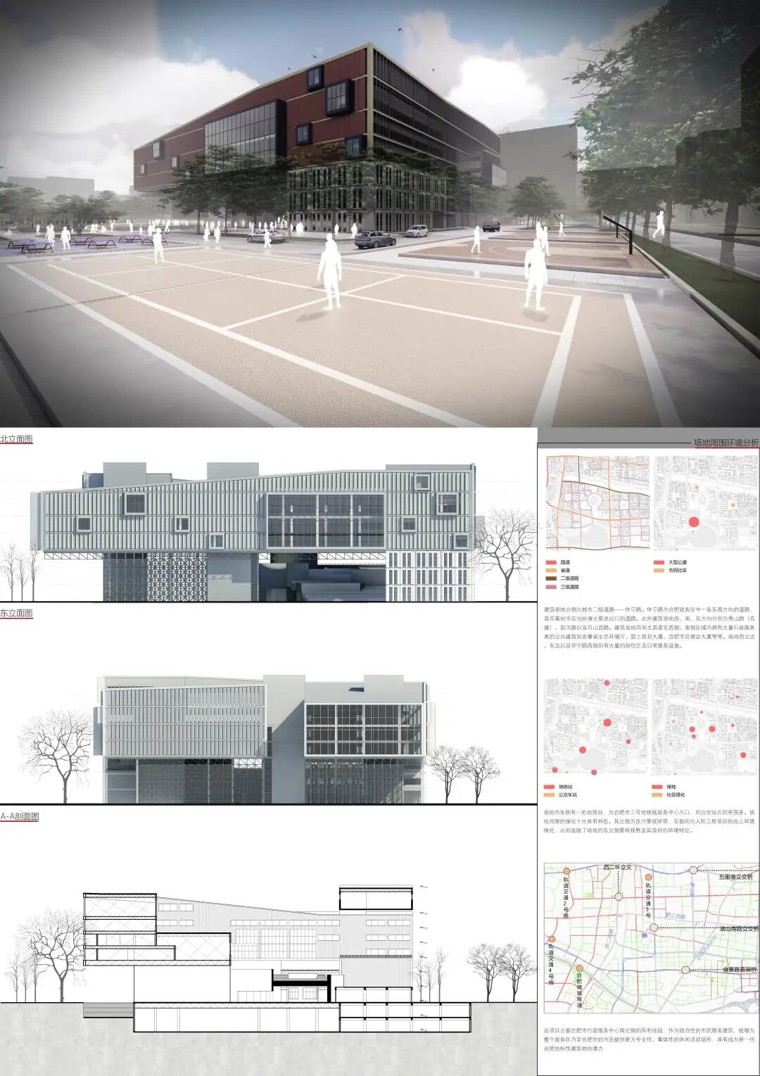 项目选址位于合肥政务区合肥市人民政府(行政服务中心)的西北侧。其北侧隔休宁路与匡河绿化带相望,东侧有一处人防工程的地上景观,场地的西侧与南侧环绕有多个合肥市行政服务机关,包括:合肥市总商会大厦、合肥市国土规划大厦、安徽省生态环境厅等。