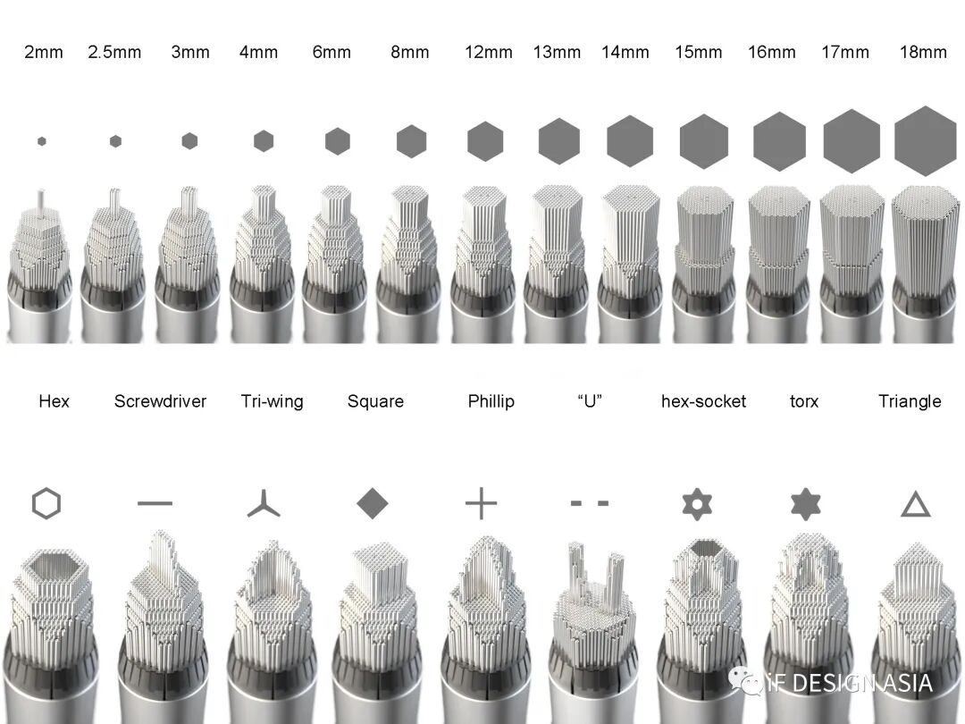 Universal Tool 为解决螺丝刀与螺丝的匹配问题提供了一种全新的方法。该产品的螺丝刀部分由数百个小型、高强度、可伸缩的单元模块组成。这些模块可以根据螺丝的类型、型号、形状和大小自动调整。然后通过固定按钮上的手柄,简单地固定这个形状的螺丝刀刀头。可变螺丝刀的变形模式适用于各种型号、型号、形状、尺寸的螺丝。