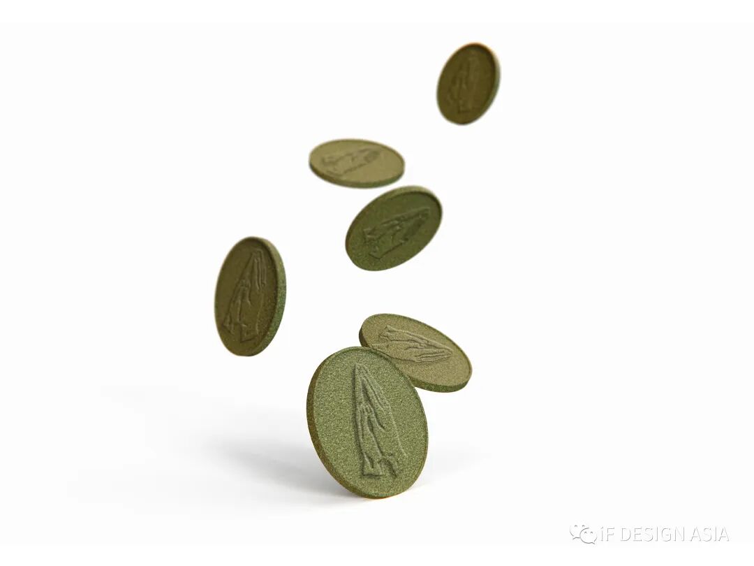 在中国的寺庙里,很多游客喜欢往池塘里扔硬币来祈求好运,这严重影响了鱼类和乌龟的生存环境。为了保护大自然的生态平衡,本设计为池塘里的动物提供硬币外形、科学配方的饲料。这既满足了人们祈福的心理需求,又满足了动物的生存需要,从而简单地实现了人与自然和谐共处的理念。
