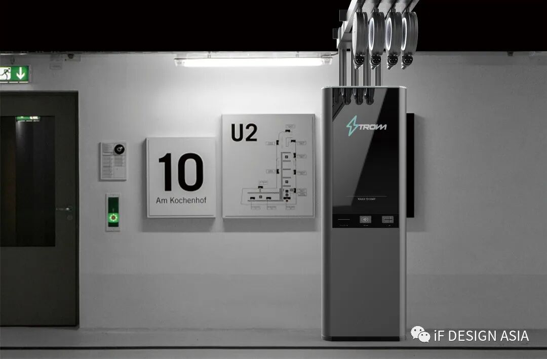 充电桩使用效率低和充电焦虑都是大问题。STROM 是一种为停车场或地下车库中的电动汽车充电的综合系统。STROM 配备有一个管理站、一个导轨系统、四个电缆盘和四个弹出式充电插头,可以每天 24 小时连续为 20 辆汽车提供充电。它甚至可以成为一个模块化系统,未来给整个停车场的所有电动汽车充电。