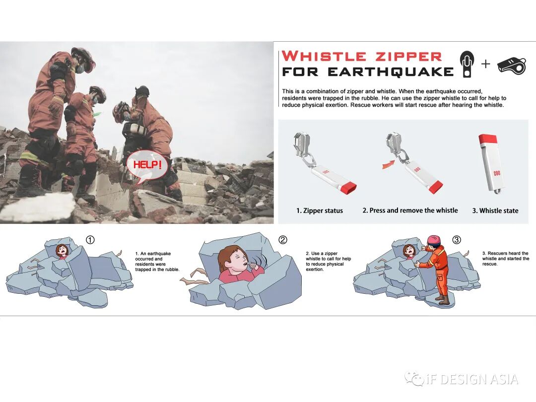 这个简单巧妙的设计方案综合运用了拉链和哨子。在发生地震或其他灾害时,被困在废墟下的人们可以用拉链哨子呼救。这比大声呼喊更有效,也也更节省体力。哨声可以引导救援人员到达被困人员所在的位置。因为灾难会突然降临,将设计融入日常衣物是一个绝妙的主意。