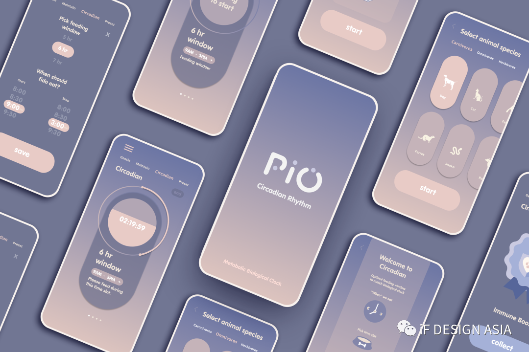 代谢疾病和慢性疾病的流行影响着数百万宠物和家畜的健康。Pio 是一款应用程序,旨在通过尊重动物的昼夜节律来预防代谢疾病。主人可以通过掌握动物的昼夜节律,恢复动物的代谢活力。Pio 的设计核心是积极保护动物健康。它把昼夜节律疗法、细胞代谢和设计巧妙地融合在了一起。