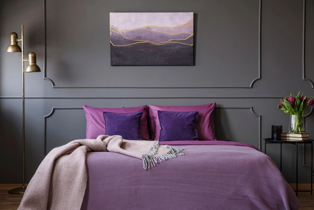 如果您想以一种微妙的方式使用色调,搭配紫色床上用品或带有深鸽灰色的艺术品,就有精致和平静的效果。