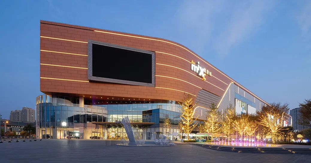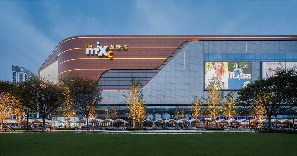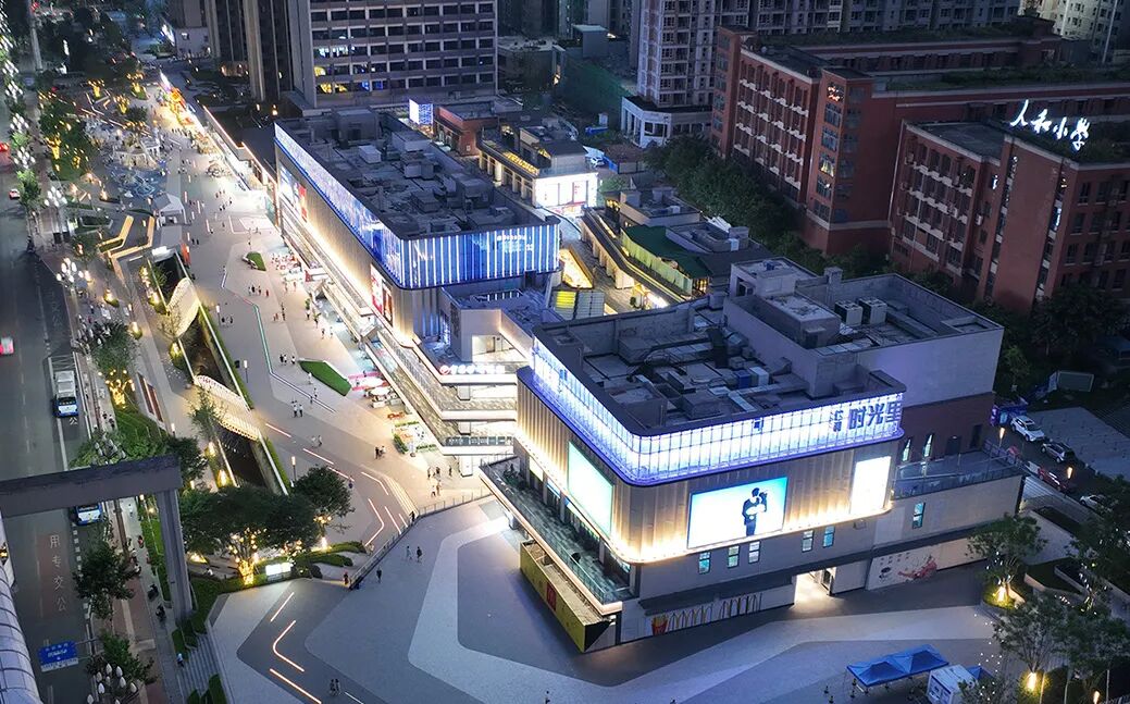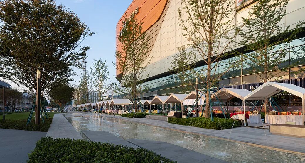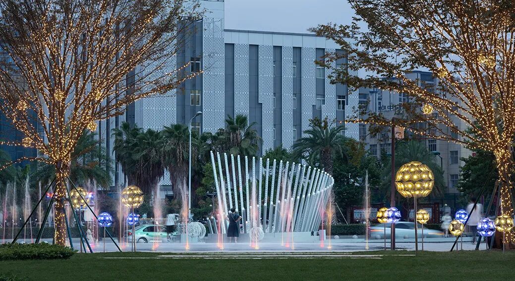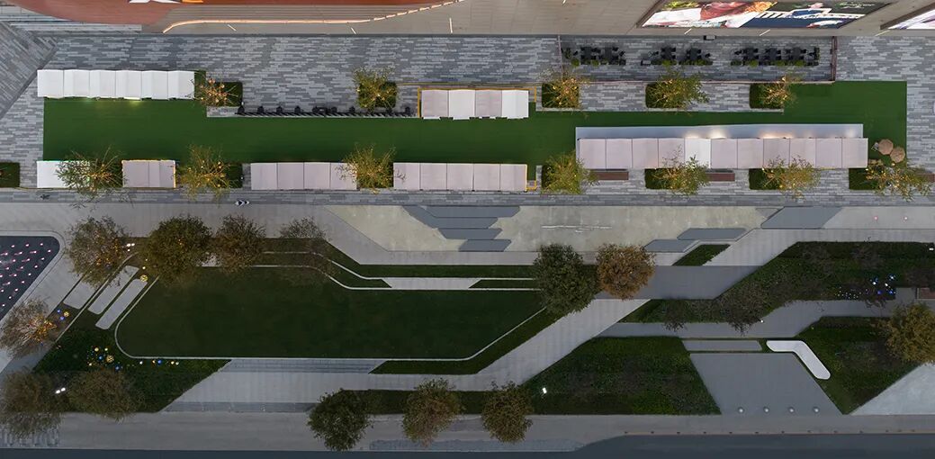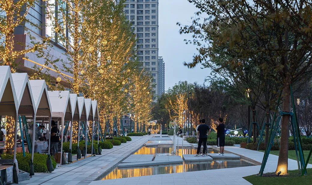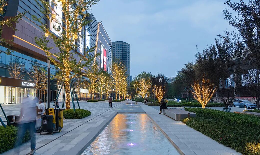 景观延续建筑现代简约的直线语言,通过对线条的不断衍生、链接,形成一种独特魅力的语言符号,将时尚、现代、互动的元素融入城市更新及建设中。在广场外侧设置绿化,树阵广场,水乐广场,游走花园、互动跳泉等,形成商业与城市绿色生态融合共生的形态,创造了居民美好生活街区,更新了街区慢行绿荫长廊。