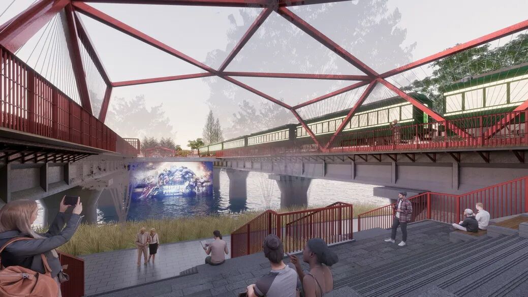 皇岗口岸是全国最大的、唯一全天候通关的陆路口岸, 将打造成为辐射大湾区、面向世界的集出入境口岸、立体综合交通枢纽、城市活力公共空间于一体的现代化国家一级口岸。设计取意深圳河稳固的基石,见证深港两岸的历史变迁,流动的形态寓意深港两地的交融和无间合作。