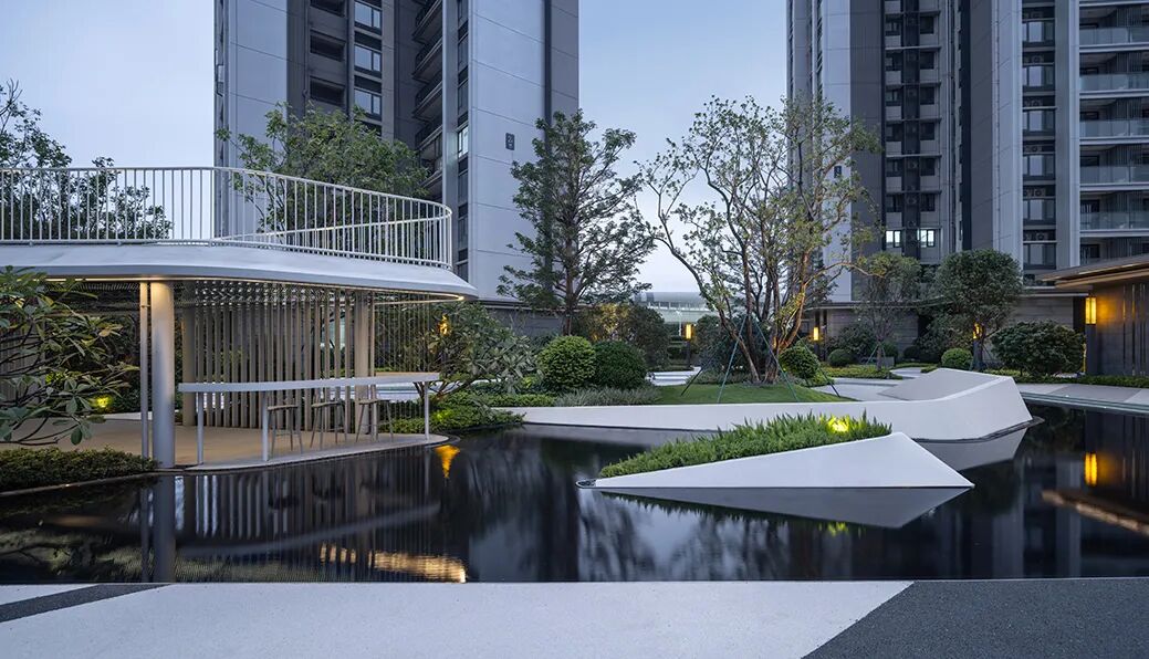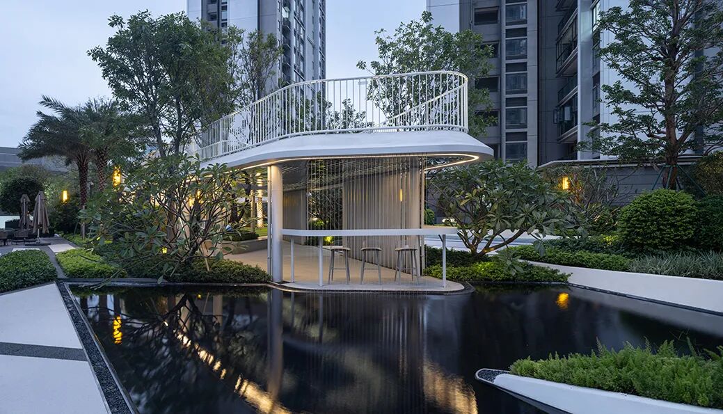 项目位于广东省珠海市斗门区黄杨河以西,东南方向为南海,是通往国际的经济文化窗口。延续通过建筑的色调语言,引入“水”元素,采用流畅的设计语言,营造灵动丰富的品质空间,与建筑呼应,打造现代时尚、休闲又有滨海度假氛围的独特风格的景观空间。
