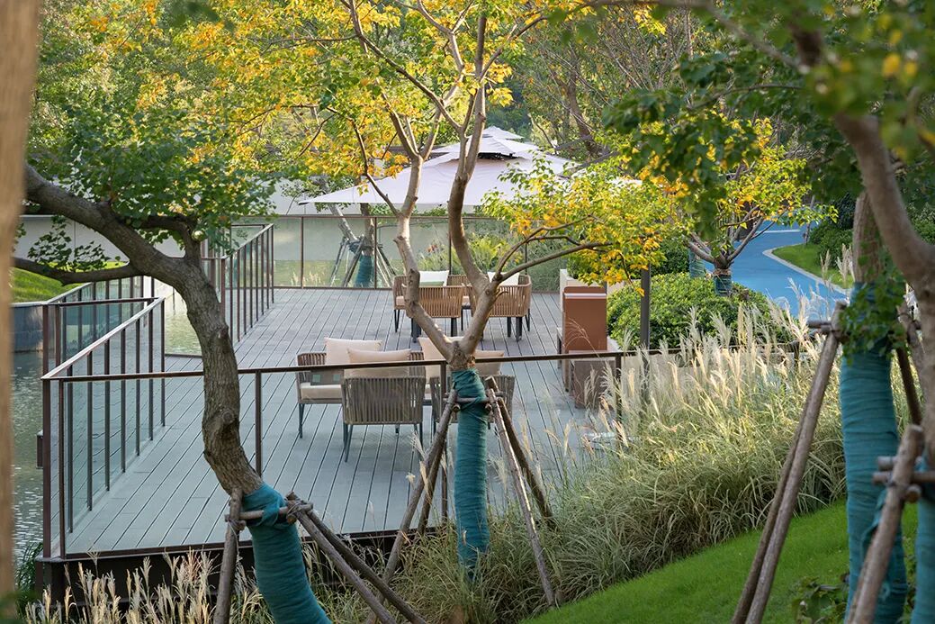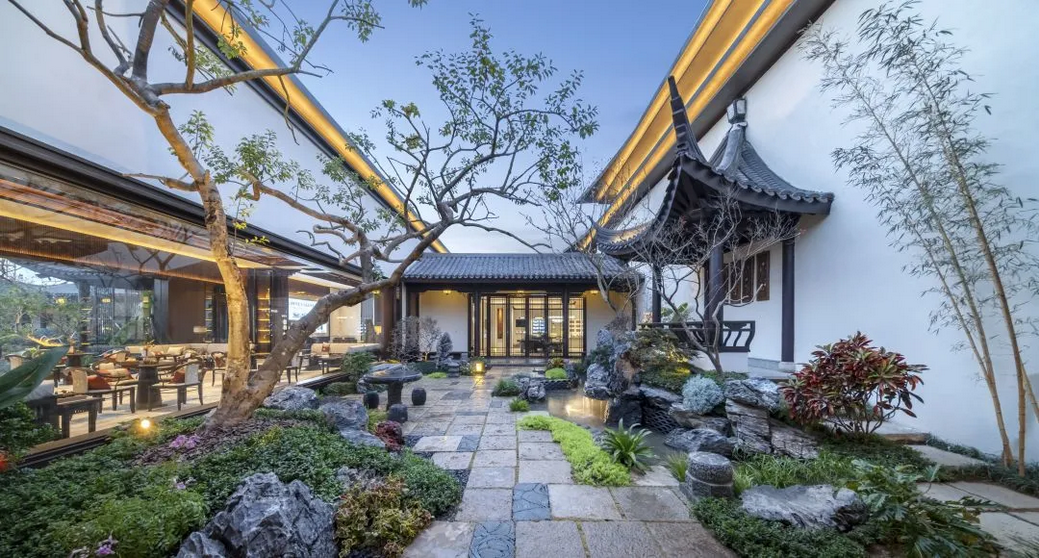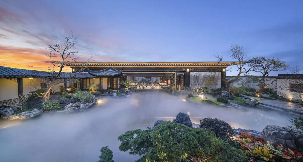 项目依靠宝清山,借势造景。引入外象,书香文脉蕴入府邸。借山望海,引书香入院,营造“山海五境,筑书香门第”,还原古贤崇尚的理想山水格局,赋予当代人文雅士般诗意的居住享受。园蕴五境,景蕴五感。在造景手法以及游园体验中融入多重感官享受,不至于眼观、形、耳、闻、味、触以及精神上都有所体验。古为今用,心向学识,传统人文元素与现代园林景观糅合。