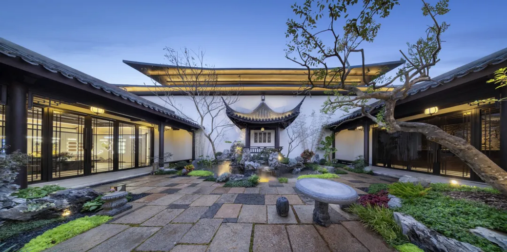 景观设计以《华山图》为灵感来源,引“园”入画。项目展示区将东方古韵融入现代生活。参仿江南拙政园,规划“三轴、四点、五组团”的立体景观,打造中式院落空间,尽显地域的文化底蕴和大宅风范。引入各种名贵植物,形成层次分明的错落景致,在实现古典美学的同时兼备功能性,将古代文明演绎成现代建筑的宜居空间。一花一草、一木一石均细心雕琢,行走其中,步移景异间峰回路转,仿若沿时光回廊溯流而上,品味汉唐遗风。