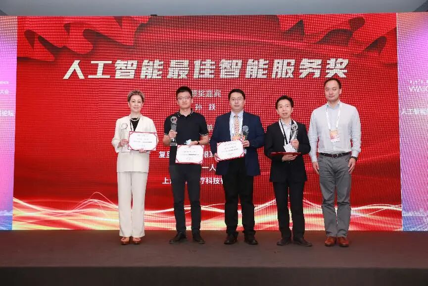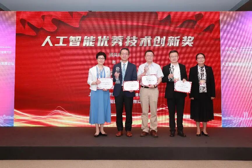 人工智能优秀技术创新奖颁奖者及获奖单位:复旦大学附属中山医院副院长顾建英、上海市肺科医院党委书记陈昶、上海交通大学医学院附属瑞金医院副院长胡伟国、上海联影智能医疗科技有限公司联席CEO周翔、上海申康医院发展中心副主任赵蓉(从左至右)