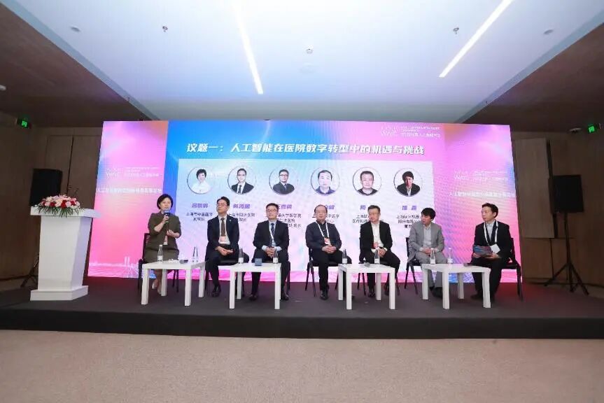 复旦大学附属中山医院副院长顾建英、上海交通大学医学院附属瑞金医院副院长胡伟国、上海市第一妇婴保健院院长王育、上海人工智能实验室主任助理王延峰、苏州微创畅行机器人有限公司总经理陈养彬、上海森亿医疗科技有限公司创始人兼董事长张少典(按出场顺序排列)
