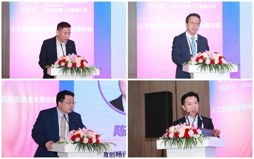 上海市人工智能行业协会政企服务部部长沈涛、上海市肺科医院党委书记陈昶、上海市第一人民医院副院长陈童、复旦大学附属眼耳鼻喉科医院院长周行涛(按出场顺序排列)
