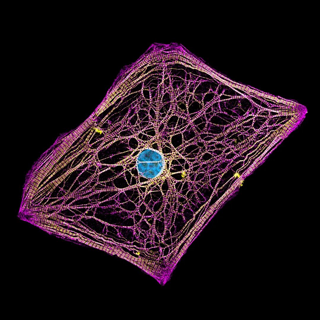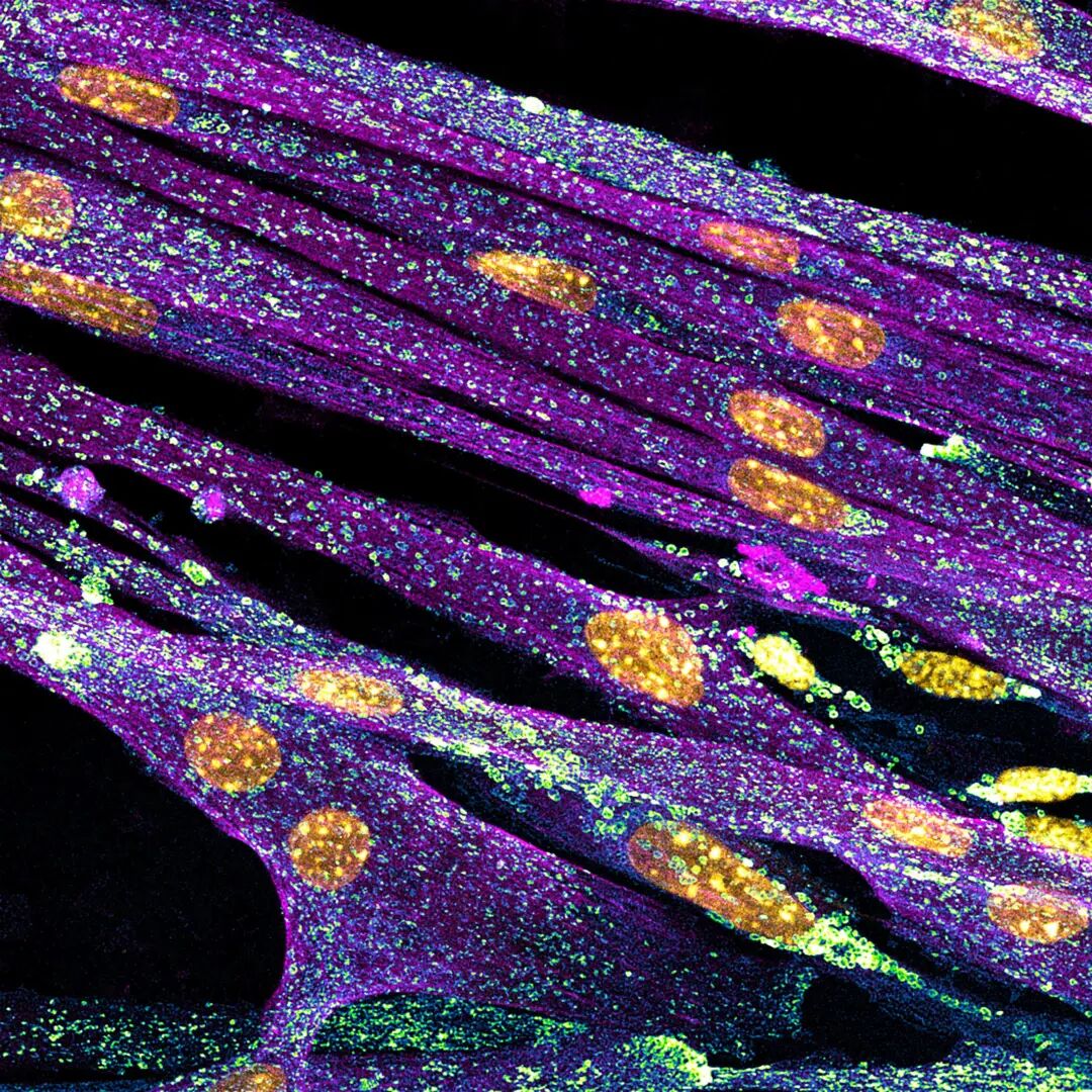 具有溶酶体(青色/绿色)、细胞核(黄色)、F-肌动蛋白(洋红色)分化培养的鼠成肌细胞