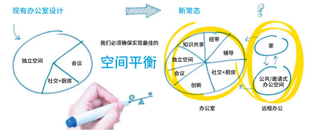 我们的目的不是设计新的办公室,而是打造能够支持新型办公模式与不同办公类型的物理基础设施,赋权员工自由选择办公方式和办公地点——传统的办公室办公、数字化办公或线上办公。