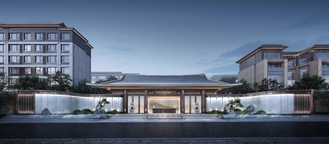 包括项目的建筑立面,用材用料也极为考究。屋顶是曲线流畅的唐风桃檐,传达“天人合一”的东方人居智慧理念;中部融入为项目量身定制的中式云纹符号,利用水平框景、金属收边等传统手法,赋予建筑内敛而时尚的底蕴;底部则以铝板幕墙、彰显门厅精致大气,重塑归家礼序。