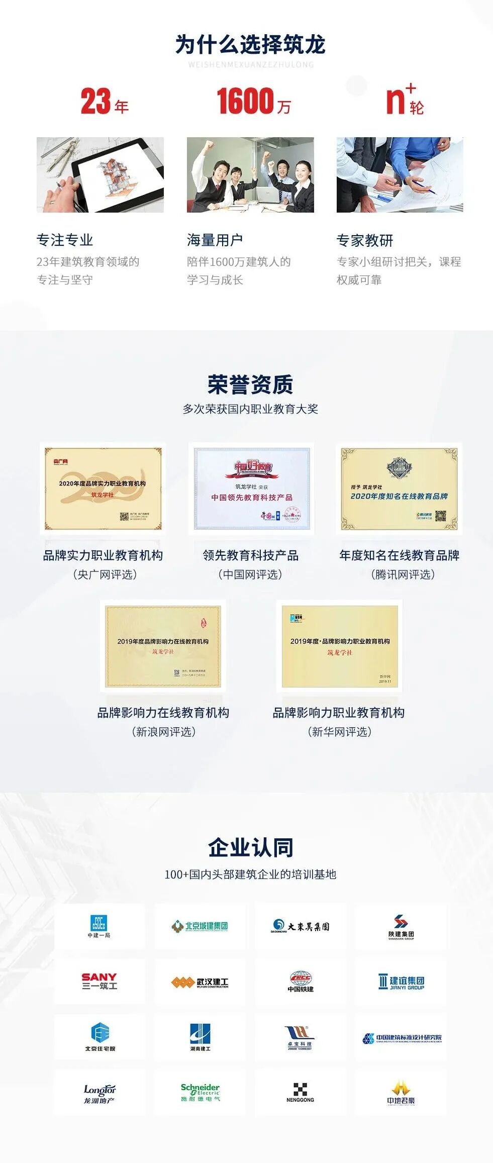 筑龙学社媒体、企业、学员认证过的品牌值得信赖:1600万的建筑人的学习社群;新浪网、新华网评选的影响力教育机构;100家业内知名企业合作