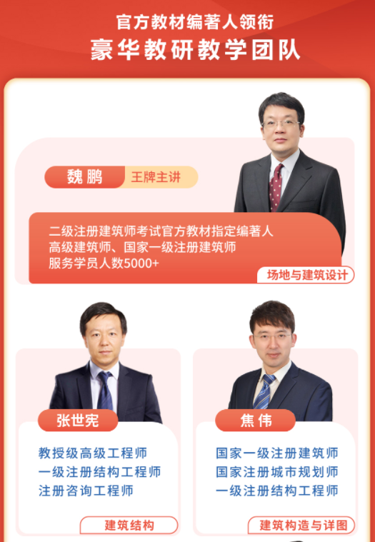 针对广大二级注册建筑师考生,在此,将"2022年二级注册建筑师协议保障班"推荐给大家,由方(建工出版社)教材指定编著人魏鹏老师等多位老师亲授。夯实基础、难点突破、考前冲刺、带你突破二注。