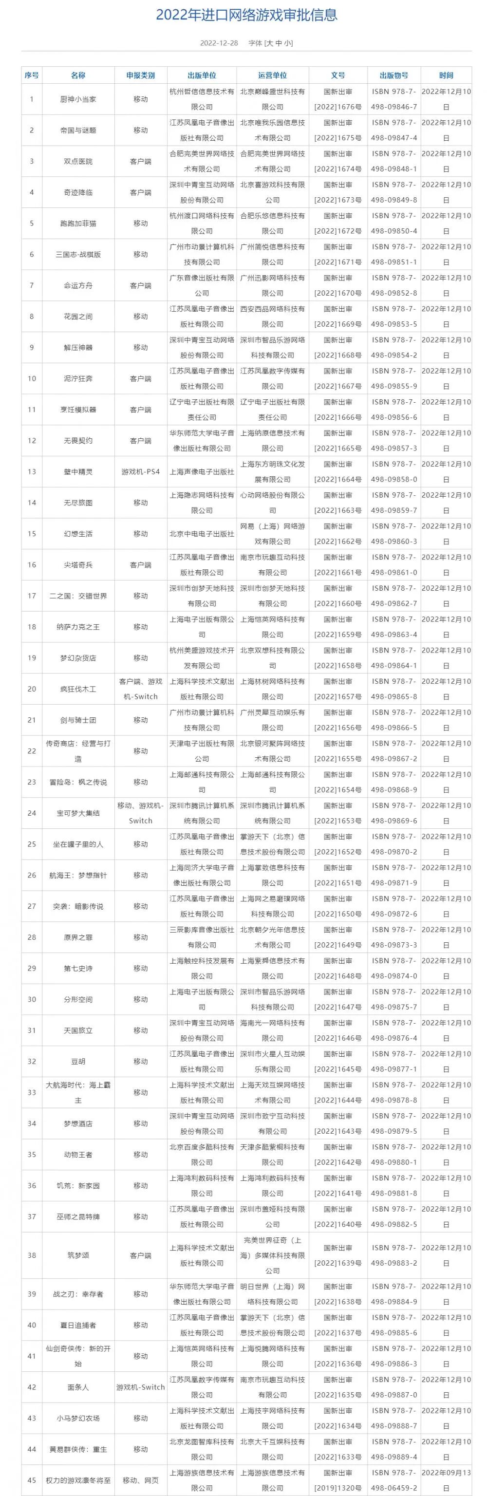 大势2023-06-22 2022年最后一批版号发放,进口游戏在列共129款过审!行业或开启反弹行情-SoulofArt 在距离2023年还有3天之际,2022年的最后一批游戏版号也来了,今日(12月28日)国家新闻出版署公开了12月的新一批国产网络游戏和2022年进口网络过审版号名单,共129款游戏过审,其中国产84款,进口45款。 相较于前几次,这次头部厂商批复的较多,其中包括:腾讯《宝可梦大集结》《无畏契约》《重生边缘》、网易《巅峰极速》《幻想生活》《突袭:暗影传说》、阿里游戏《三国志-战旗版》、心动《火力苏打》《无尽旅图》、西山居《尘白禁区》、完美世界《双点医院》《筑梦颂》、吉比特《渊海王座》、游族《权力的游戏凛冬将至》、波克城市《暮夜传说》、雷霆《渊海王座》、世纪华通《饥荒:新家园》、恺英《仙剑奇侠传:新的开始》《纳萨力克之王》、掌趣《异世界的和弦》、创梦天地《团子合合屋》《二之国-交错世界》、陌陌《童话镇大冒险》等等。 腾讯天美《宝可梦大集结》 创梦天地《二之国:交错世界》 西山居《尘白禁区》 阿里游戏《三国志-战旗版》 除了国产游戏之外,此次还发放了一批进口游戏的版号,共计45款游戏过审。这是时隔548天再发进口游戏版号,由拳头游戏开发的第一人称射击游戏《瓦罗兰特(VALORANT)》国服过审,中文名《无畏契约》。 此外还包括腾讯的《宝可梦大集结(移动+NS)》、《壁中精灵(PS4)》《双点医院》《筑梦颂》《第七史诗》《仙剑奇侠传:新的开始》《面条人(NS)》《二之国:交错世界》《疯狂伐木工》等。 是谁狂喜?! 这是今年第7次发放游戏版号。截至12月28日,2022年共有523个版号过审,较2021年(767个)同比减少约32%。在游戏版号停发的8个月里,国内共有2.2万家游戏公司注销。2022年4月11日,时隔263天游戏版号重新恢复了发放,这个决策对于今年略显萎靡的游戏行业来说,犹如雪中送炭。 从4月到9月,版号持续而上升的发放,4月45个,6月60个,7月67个,8月69个,9月73个。而到了10月,无征兆的并无发放版号,这是步入2022年后的国内游戏市场“史无前例”的遭遇了一年内两次版号暂缓发放的情况。到了11月又一次开放版号,共有70款游戏过审,再一次给游戏行业一剂强心剂!虽然很难,但总要相信还有曙光在的!游戏人加油!!以下是12月过审版号的完整名单 ↓↓↓ 本文来自微信公众号“SoulofArt”(ID:Soul_Art)。大作社经授权转载,该文观点仅代表作者本人,大作社平台仅提供信息存储空间服务。 TAGS: 游戏版号行业 相关文章2022年7大设计趋势,你…2023女装T台关键工艺 …大人就是要带着他们“爱”的…首个元宇宙国家?!# Tu…趋势 | 2023智能驾驶…设计趋势丨未来设计:塑造元…2022-2023 家居饰…Pentawards评委刘…科技景观将是未来新趋势从广东望世界:家居行业开年…