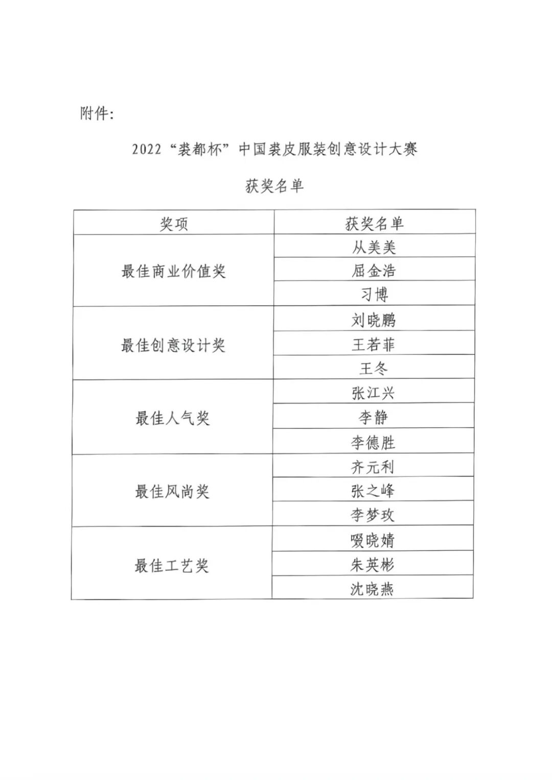 由中国服装协会、衡水市大营毛皮行业协会主办,河北省毛皮产业协会、穿针引线网协办的2022“裘都杯”中国裘皮服饰创意设计大赛经三个月的报名、选款、线上评审与线下复核工作,最终组委会评选出奖项如下:最佳商业价值奖3件、最佳创意设计奖3件、最佳人气奖3件、最佳风尚奖3件、最佳工艺奖3件。现将获奖名单予以公布,获奖名单请见附件。