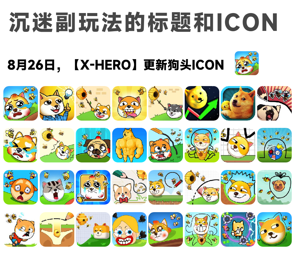 2022年是手游爆款营销事件频出的一年,以老游翻红届大名鼎鼎的【X-HERO】为例,从其更新狗头ICON起,RPG正式掀起画线狗头买量热潮。