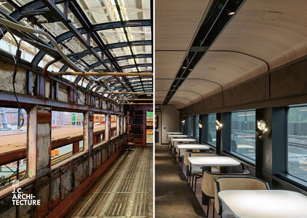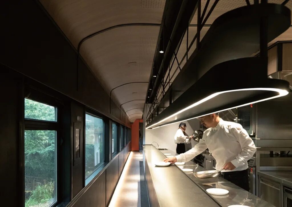 鸣日厨房是台湾知名观光列车鸣日号的升级版,由台湾铁路局和柏成设计事务所携手打造。餐厅由一辆70年历史的半退休火车改造而成,包含一节厨房车厢和两节用餐车厢,共设有54席座位。车厢以黑色为主要色调,搭配鸣日号的招牌金色点缀,融入了竹编、木纹、石头等多种台湾在地元素,打造出优雅奢华的质感。