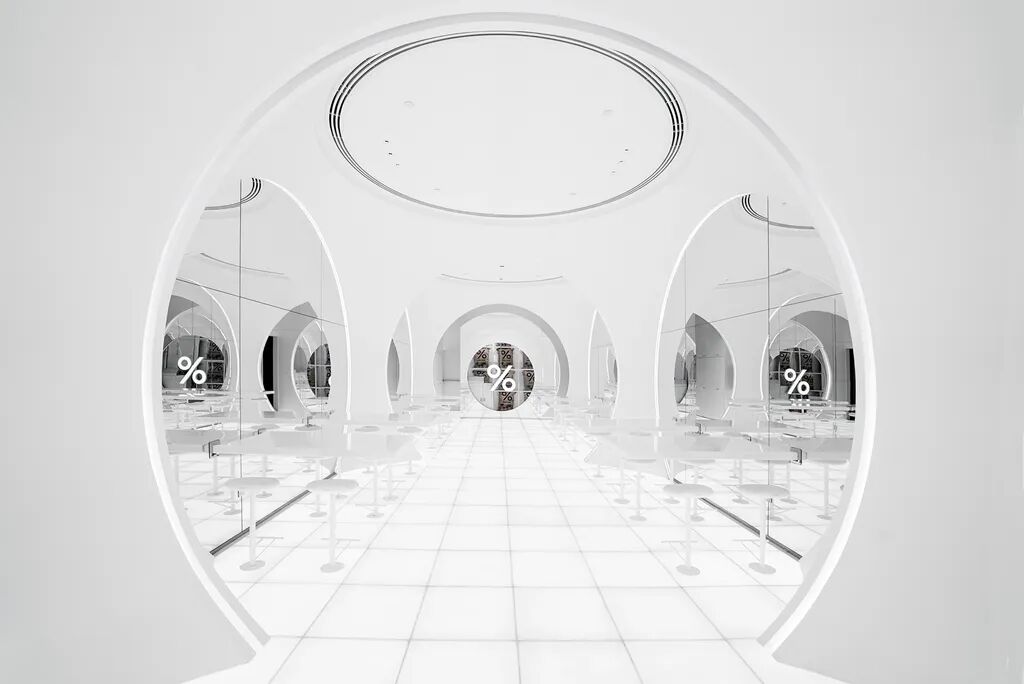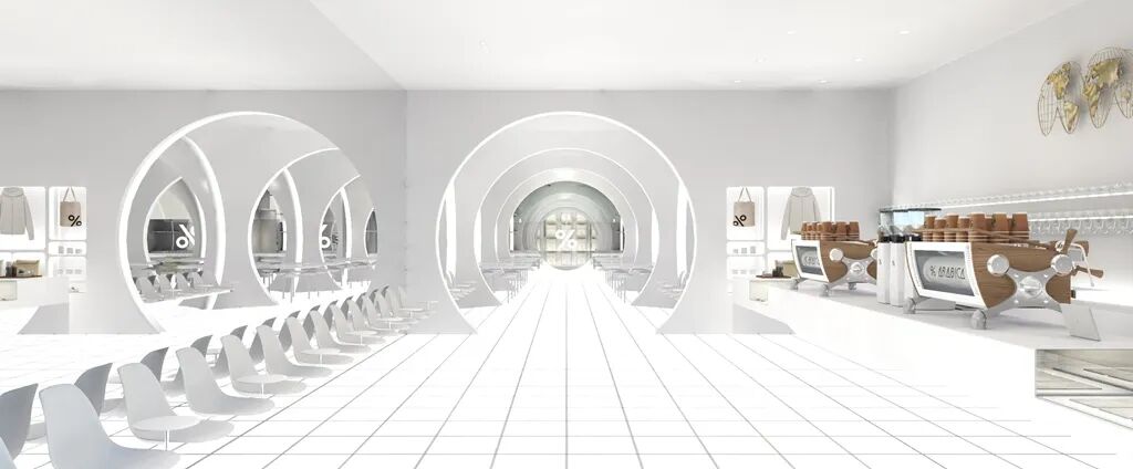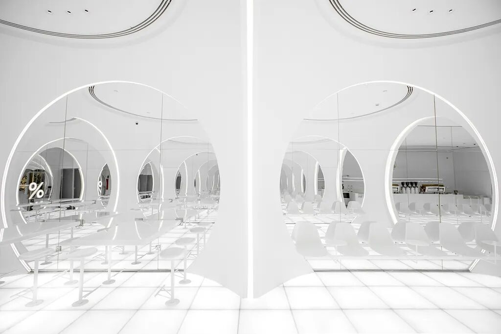 团队提取了传统伊斯兰建筑中的拱形元素,衍化为店铺内的一系列圆形拱门,形似清真寺的走廊,透光的地板及墙上的大量镜面使空间十分明亮。