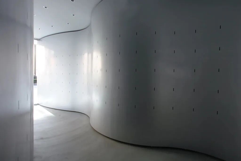 一堵弯曲的长墙组织起各个空间,墙壁表面刷有铝银反光涂层,将周围环境反射容纳其中,街道的景色、来往的行人、当下的天气,连同古书一起,在墙面上创造出新的景观。