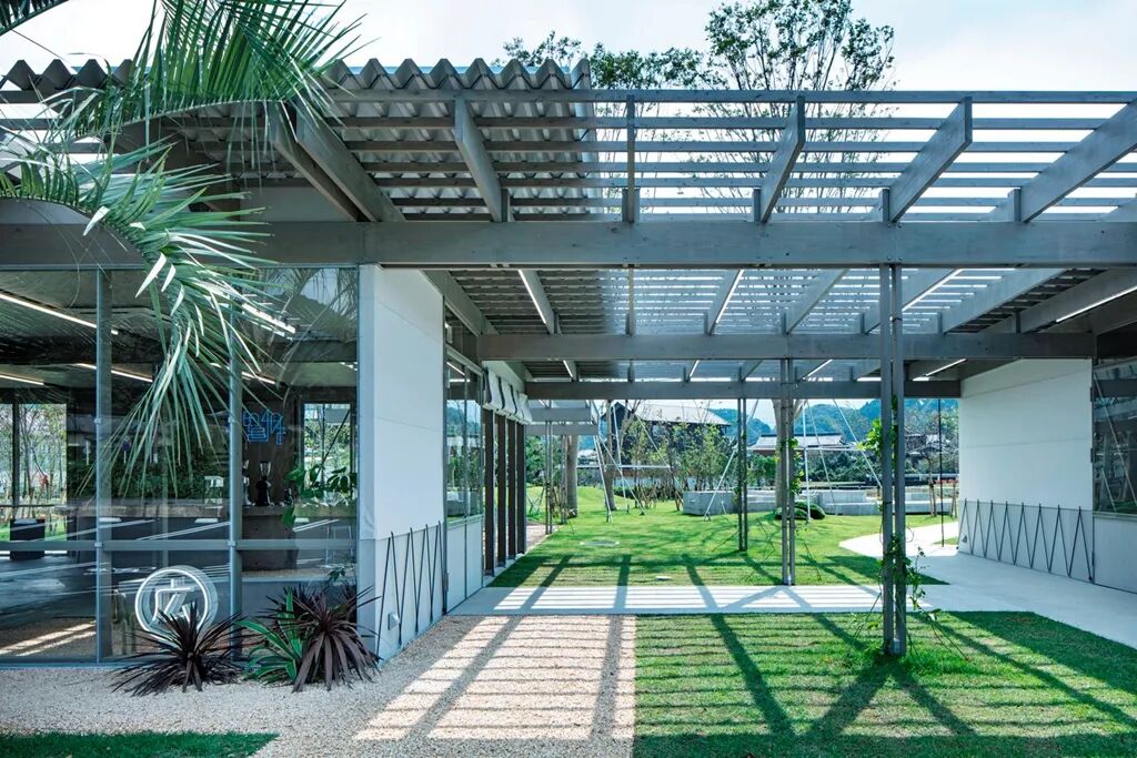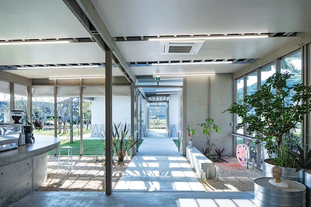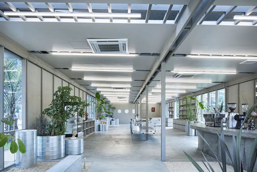 整体设计围绕“田野”的概念展开,钢结构的格栅顶棚组织起整个建筑框架,少有实墙,落地玻璃及天窗的大量运用让室内也十分明亮开阔。商店入口处,从里到外连续铺设着陶瓷产品的原材料——陶石,上面种植有各种观赏植物,钢柱上缠绕着常春藤,引入自然、惬意的氛围,同时弱化了室内外的边界感。