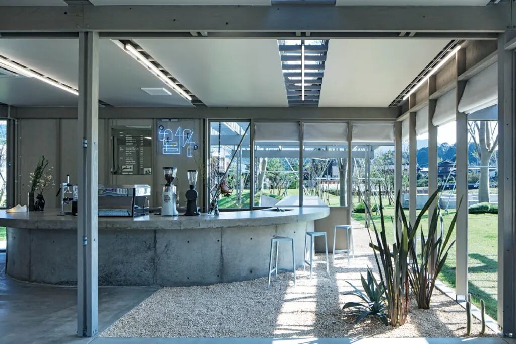 咖啡馆里,8米长的弧形砂浆桌台也从室内延伸到半室外,阳光明媚的日子里,客人们可以坐在露台上,吹着微风,享受一个美好的下午。