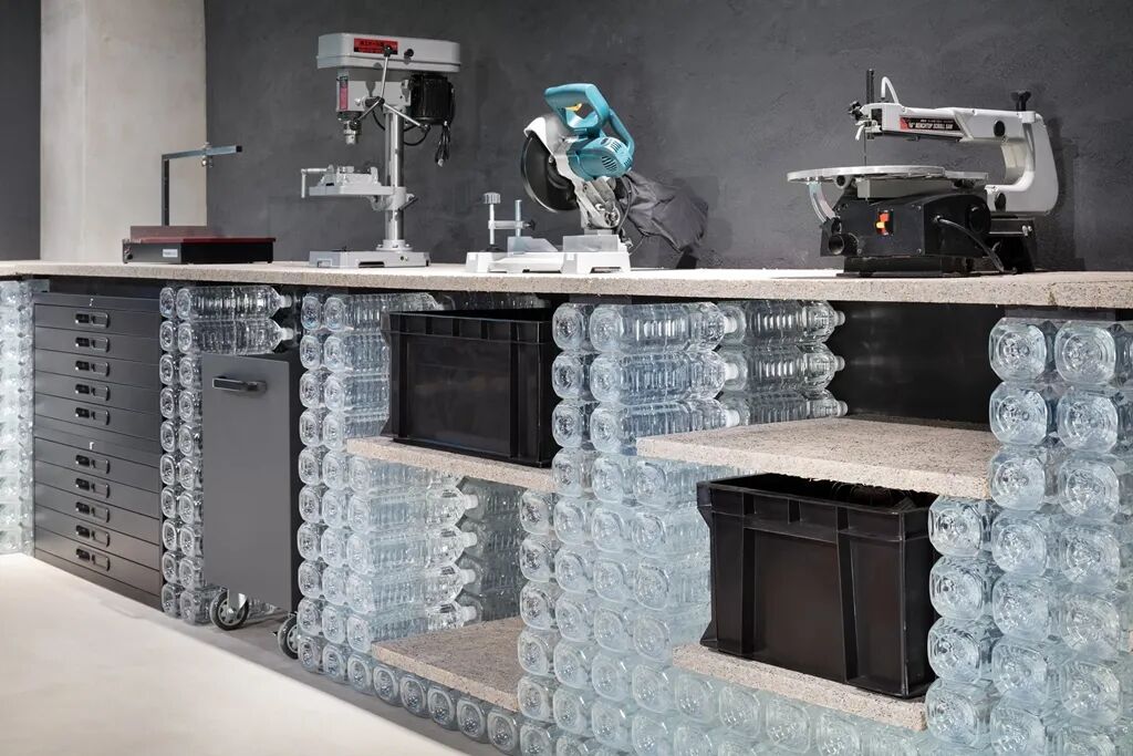 上百件各异的窗户组成了建筑外墙,来自蘑菇种植厂的塑料筐被用作储物格,陶瓷餐具碎片作为骨料被填进地板。再利用商店中,居民们可以带来他们不需要的物品,也可以免费带走。