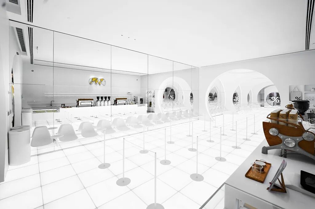 去年底,网红咖啡%Arabica首次将店铺开进了阿拉伯,设计请来多次合作的日本建筑事务所no. 10。空间延续了%店铺一贯的白色简约基因,设计师尝试削弱环境的色彩与阴影,从而在视觉上突出产品。