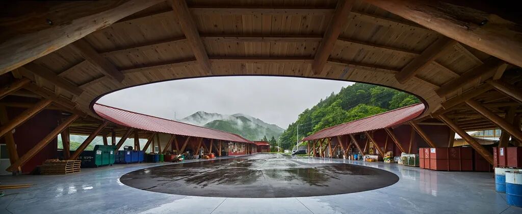这个零浪费中心位于日本德岛县上胜町,从高处俯瞰,建筑形状如同一个大大的问号。弧形的回收站共有45个垃圾分类类别,回收率超过80%。为方便叉车和卡车运输可回收物,车流线被安排在环形内部,人流动线则布置于建筑外围。