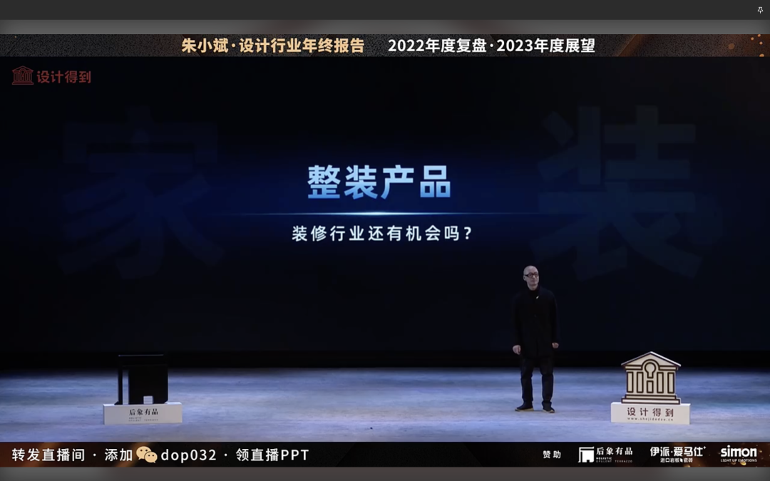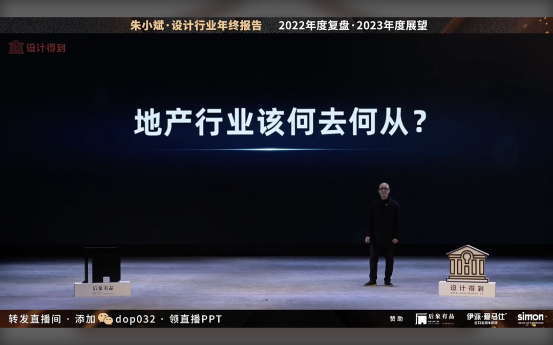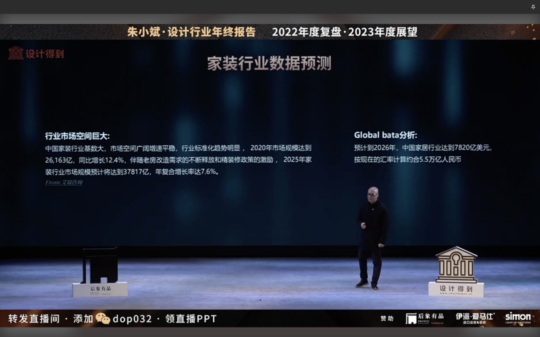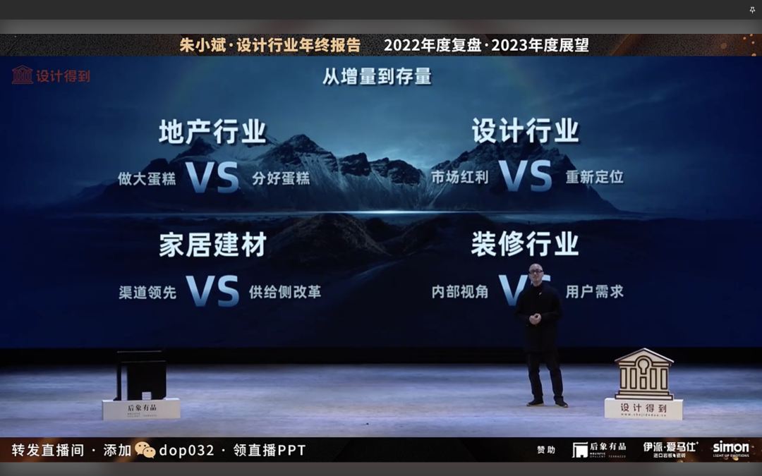 今天分享从地产到设计到建材、家居、装修4大板块,背后最大的市场变化从增量市场开始进入了存量市场。在这个过程中,如果我们只是看到这个数字的变化,但是我们的思考方式,做事方式,做事习惯,如果没有发生变化,你会越来越难过,你会越来越难以适应。
