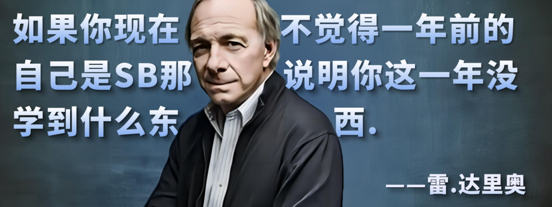 曾经有一位老师,说过一句话一直激励着我到现在,他就是《原则》的作者——雷·达里奥,他曾经在一次演讲中说:如果你现在不觉得一年前的自己是个SB,那么说明你这一年没有学到什么东西,我经常用这句话来激励自己,也就是SB指数决定了你在过去的一年成长的速度。