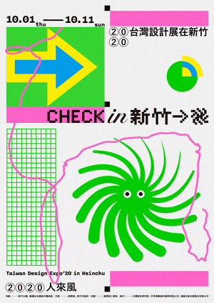 主题为“Check in 新竹—人来风”,由叶忠宜操刀,使用大量活泼、弹性的符号来营造,还结合了台湾常见的「LED跑马灯」,像素文字呈现,创造各种应用可能。