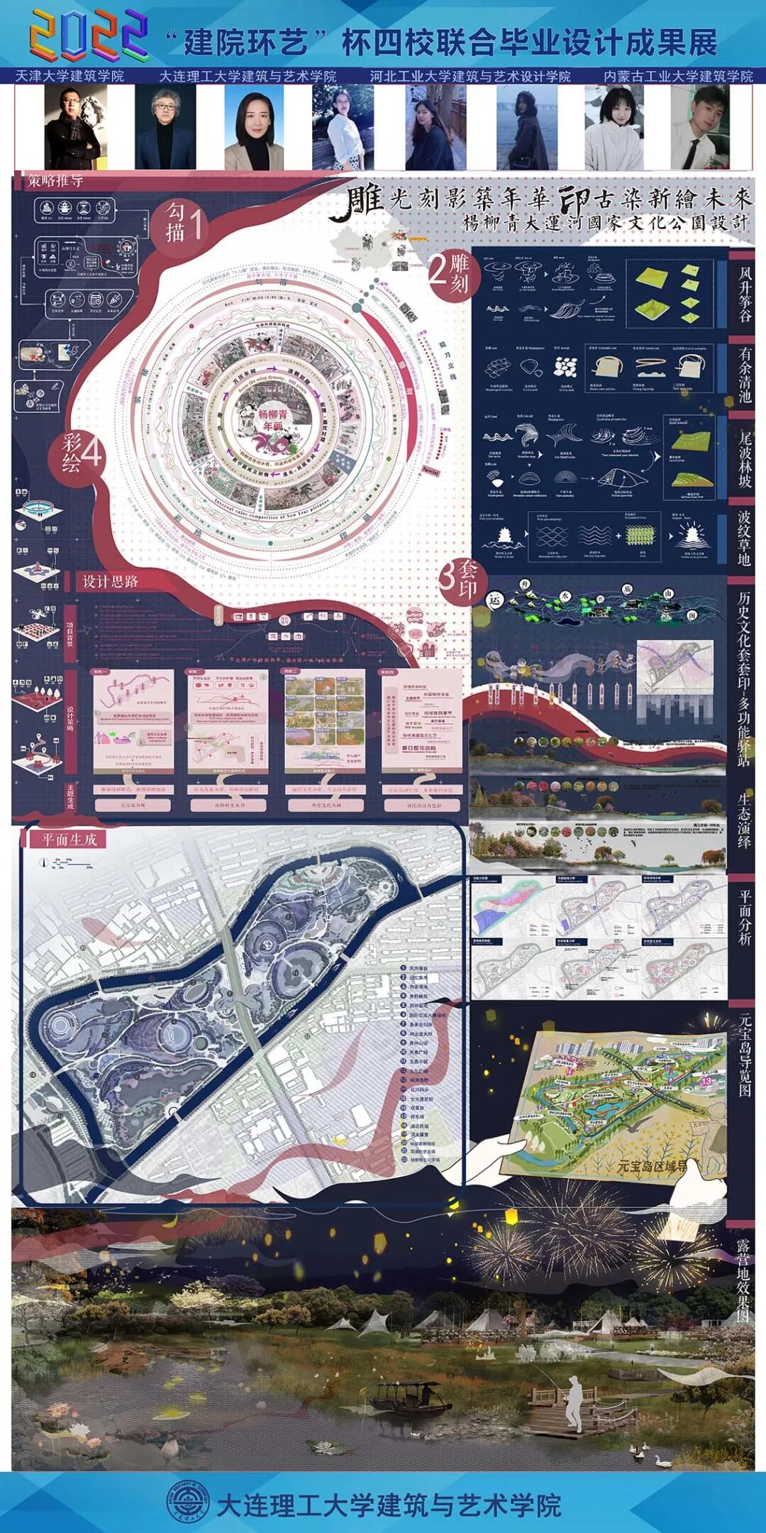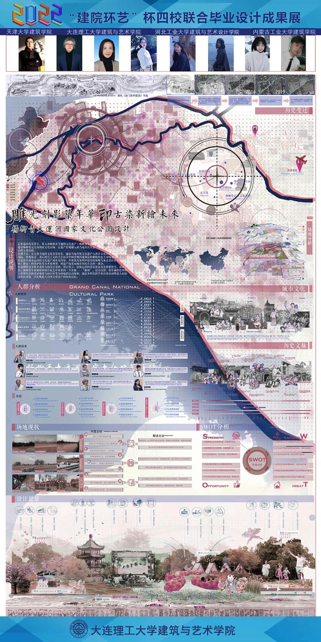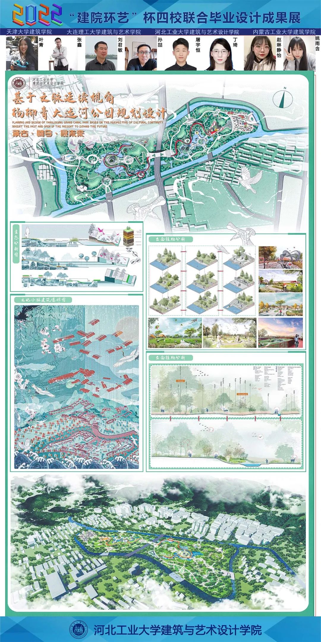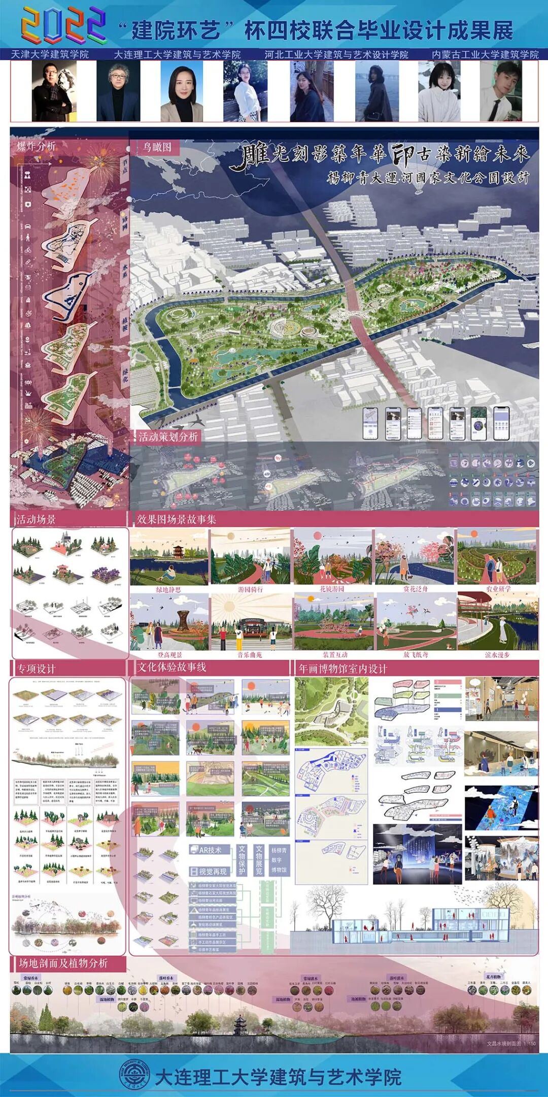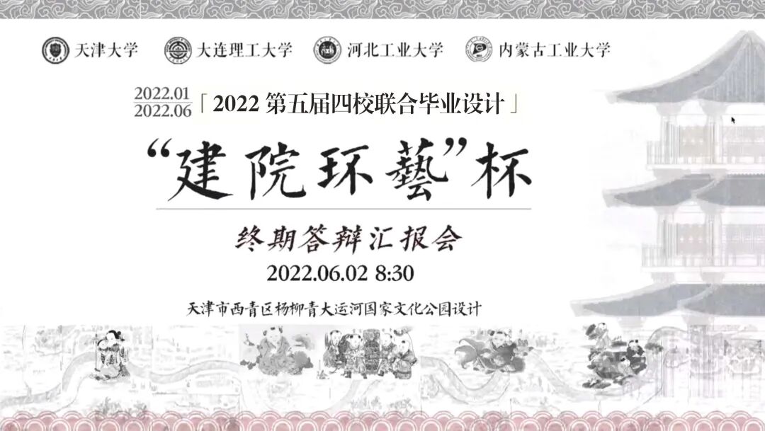 2022年6月2日,天津大学-大连理工大学-河北工业大学-内蒙古工业大学共同参与的第五届“建院环艺”杯四校联合毕设的终期答辩汇报会,以线上的形式圆满举行。会议由4个学校39名师生相聚云端,以“文化传承——天津市西青区杨柳青大运河国家文化公园设计(元宝岛)”为题。进行了成果分享和深入的交流。
