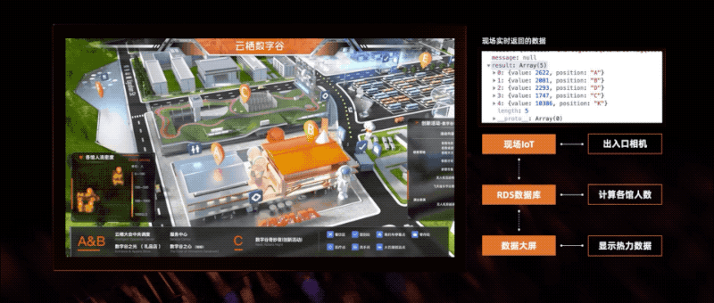 从现场的IoT设备返回的相关数据经过RDS数据库的数据处理后在前端大屏进行各馆的实时热力值显示。