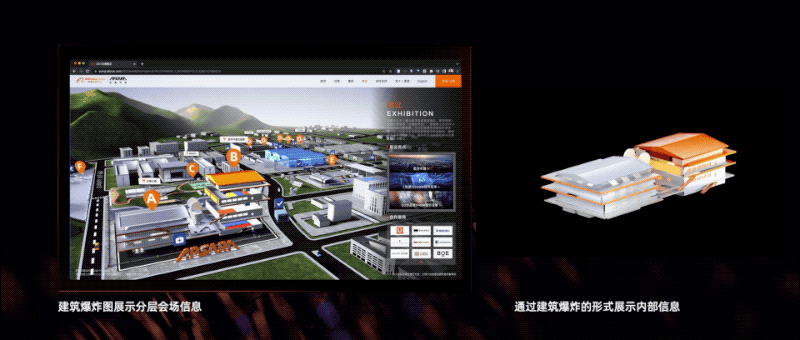 我们通过建筑爆炸图的拆解方式,把多层建筑的会展信息进行竖向的展示,用户可以“打开”建筑看到需要的信息。同时更好,更直观的看到每一个会场房间中正在发生的会议与展览信息。