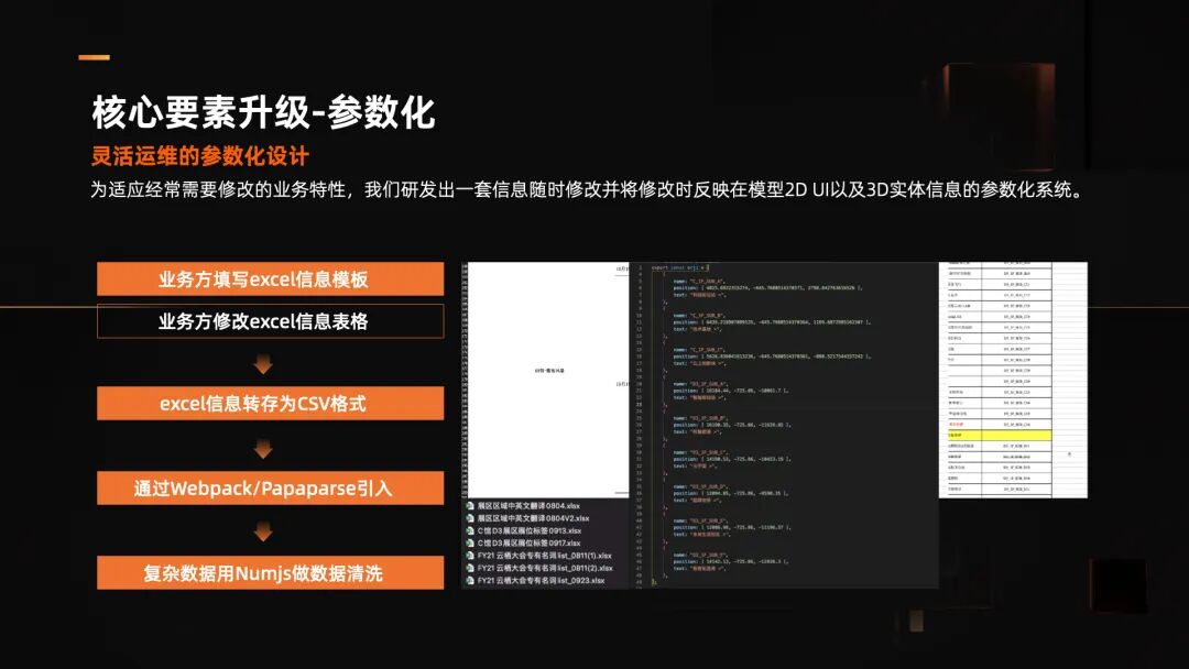 由于会展行业特性,展商、论坛信息、会场运营等需要经常更新,于是我们优化出了一套方法与相关工具,业务方只需要持续更新一份数据文件,该文件中的数据可实时同步到数字巡展产品代码里面,并且在三维场景中进行信息、模型的前端展示,大幅提高了效率。