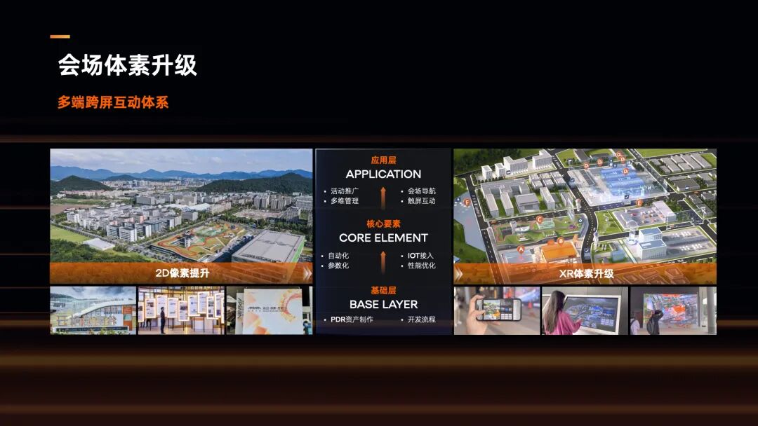 最后是应用层的搭建。我们首先搭建了多屏夸端的应用体系,让用户可以在线上与线下,会前,会中,会后都能够随时使用该数字导览产品的各项功能,为参会带来更好的体验。