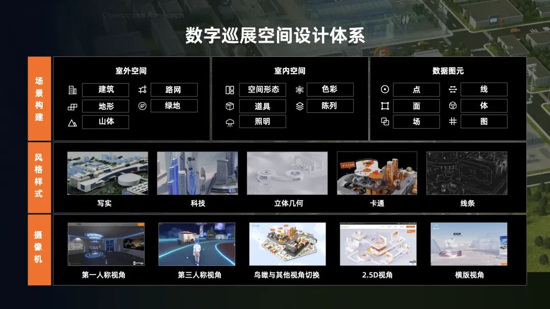 在整个项目过程中,我们需要有一套完整的从设计到建模到交付的过程。首先是空间设计,我们有一套完整的空间设计体系,通过场景的构建,模型风格的选择,以及不同的相机视角完成空间故事线。