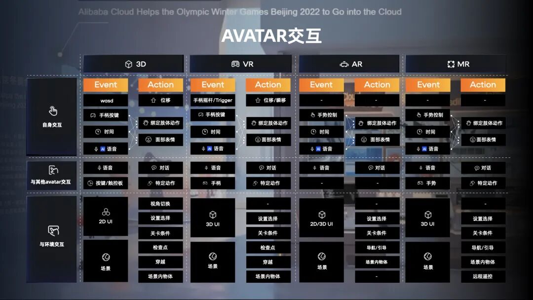 在有了场景以后,我们需要交互的设计。在交互设计中我们有三个核心,即故事性,通过故事的方式让用户能够根据有存在感;静交互,即在用户有头戴式设备需求的时候,通过更智能、安静、自动的交互方式让用户更轻松的体验;游戏性,即希望通过更具游戏特点的交互设计留存用户,让用户更具有沉浸感的体验。在具体的交互中我们将这些特点分为场景交互和Avatar交互。
