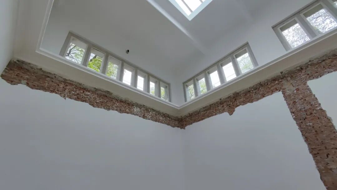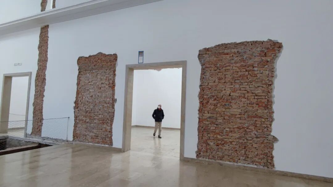 德国馆呈现了Maria Eichhorn的极简装置,展厅被改造为一座空荡荡的场地,场馆内大部分建筑骨架和墙面上的砖块都暴露在外,剥离的墙面仿佛将展馆还原为历史的纪念碑。