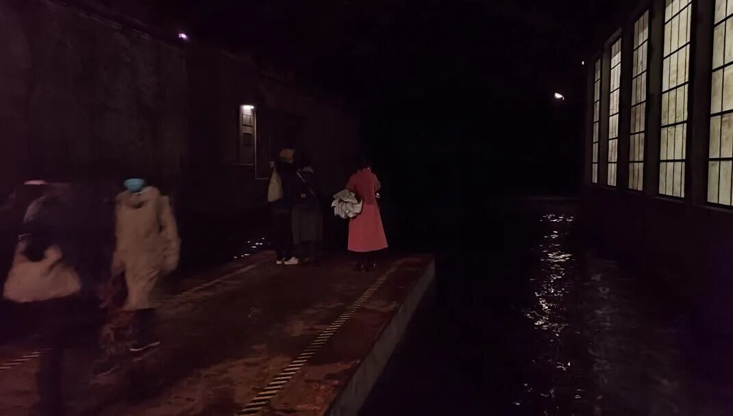 展览的第二部分,先来到一个充满柱子的空间,然后顺着窗口和走廊,观众会来到一个沉浸在黑暗中的工业码头,漆黑的环境、不断拍击堤岸的海水以及声音,再加上远处昏暗的灯光,营造出一种有点恐怖的氛围,但同时点点灯光似乎又蕴藏着希望在里面。