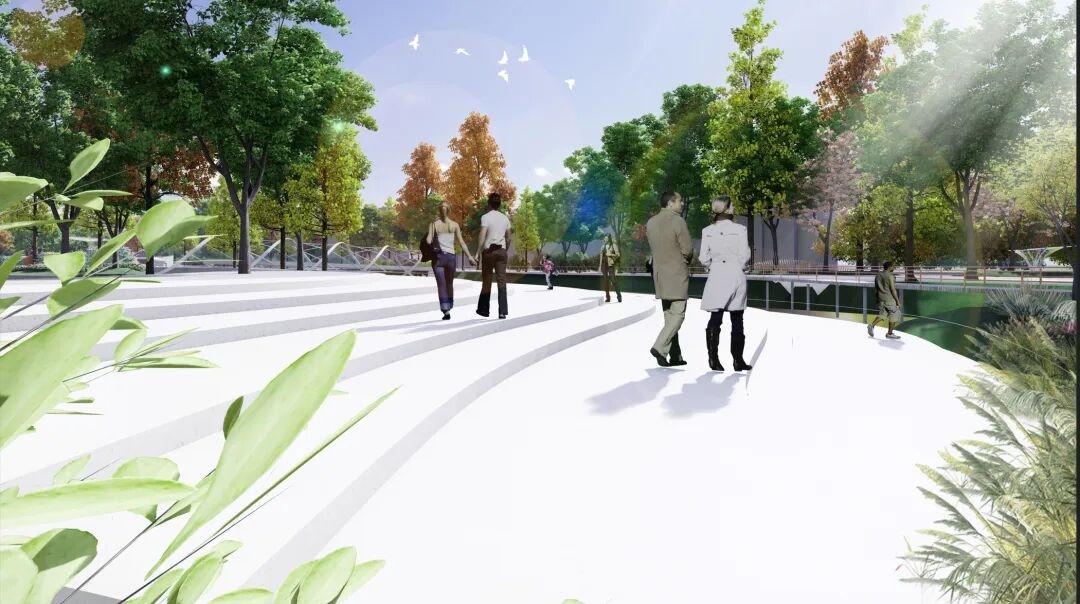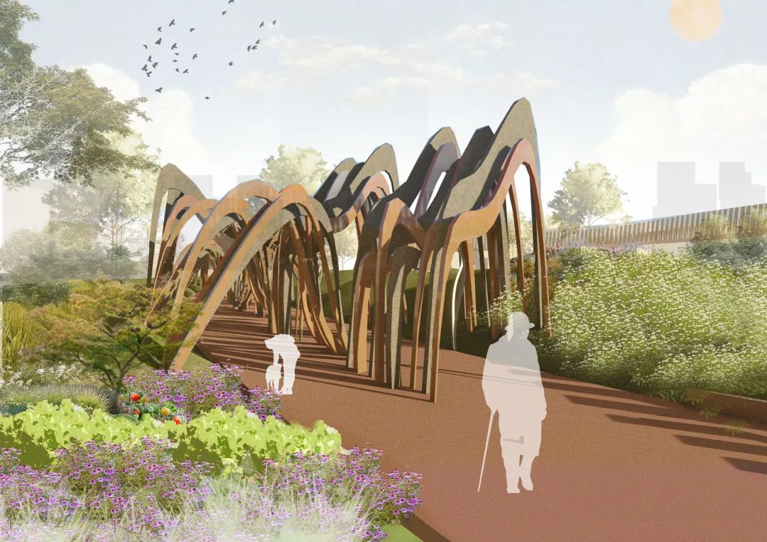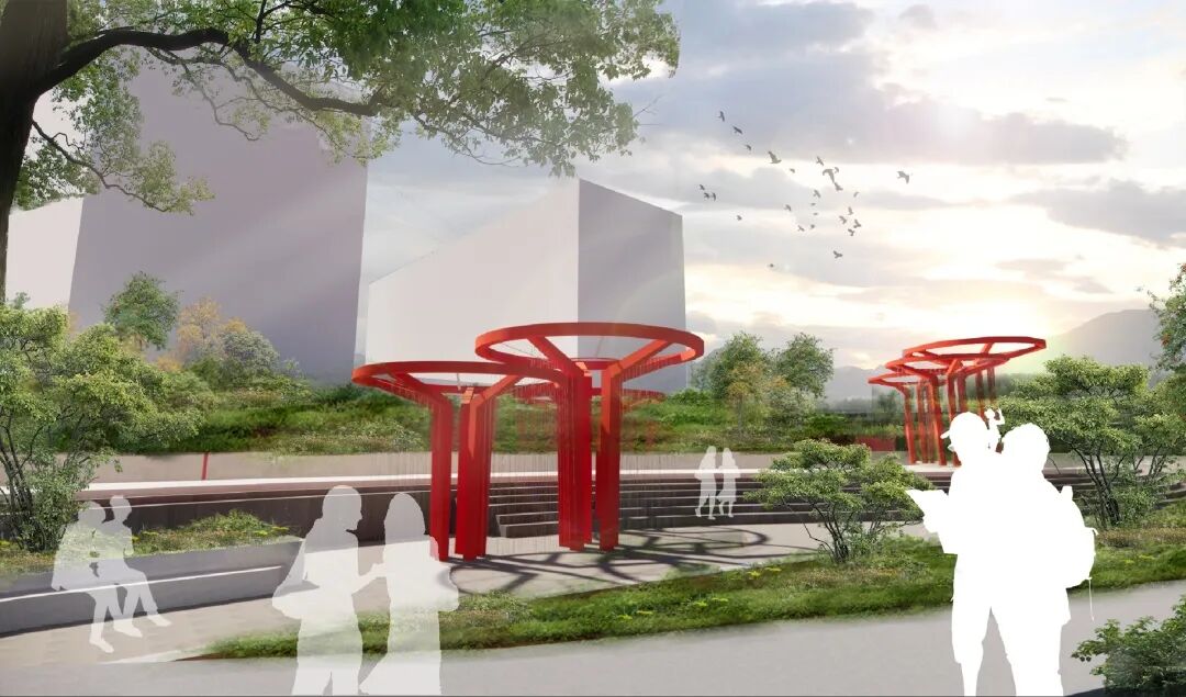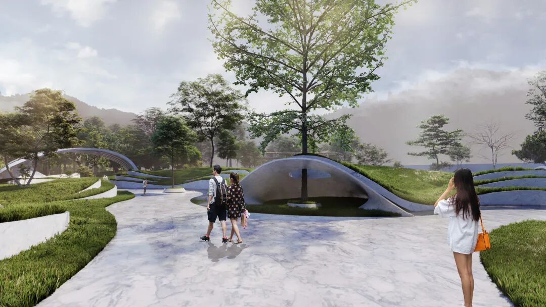 设计元素主要提取时间长河里,记忆脉络的延续。人的身体由无数脉络组成,诚然记忆中的御临河也如此,它的脉络在于它的使命,在于它承载的记忆。又到凤凰花朵开放的时候,想起某个好久不见的老朋友,记忆跟着感觉慢慢变鲜活。记忆脉络通过叶片的筋脉意向表达,提取出类似叶脉经络的形式加以转换,延展、扭曲为场地的平面形式。在这世上有多少城市的轮廓,能令我落泪但我只认得,一座梦里也能寻到回去的路故乡记忆是脉络的延续,而时光的河已入海流。