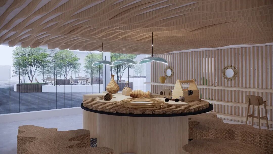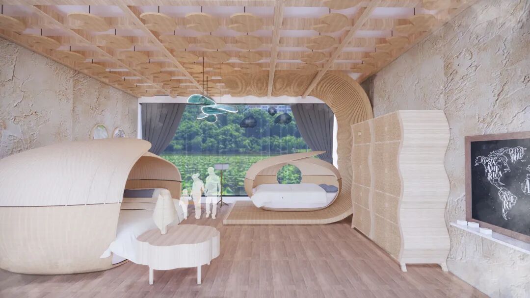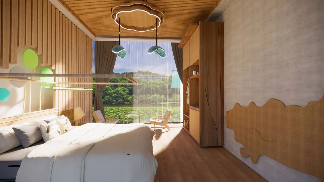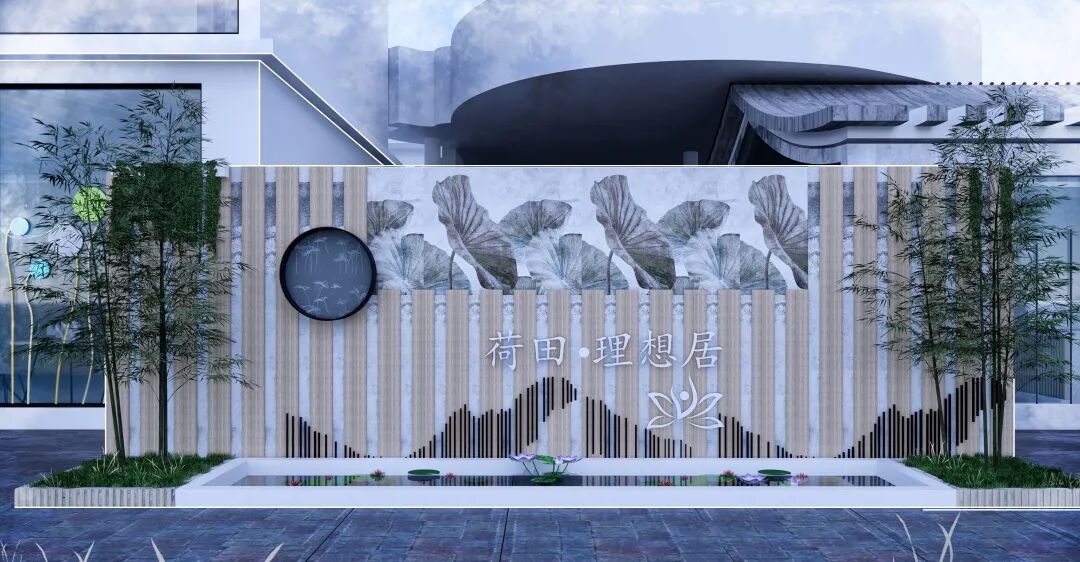 荷美·理想居”的设计构想是置身于荷田中的一座民宿建筑,场地四周被荷田环绕,拥有开阔的视野,仿佛是置入在荷田间的小屋。设计思路充分利用文武田园的景观元素--荷叶,利用荷叶外形的曲线打造室内空间和院内景观,曲线的多变性与律动行可以使空间更具有丰富性,也为整个民宿建筑增添灵动性。室内采用大面积的落地窗尽可能的吸纳更多的光线,令其在清晨、午后、傍晚等不同的阶段都有着光影的洒落以及良好的观景视野。设计规划也充分发掘高县的本土文化元素,在此基础上进行创新,打造荷田中的一座民宿。